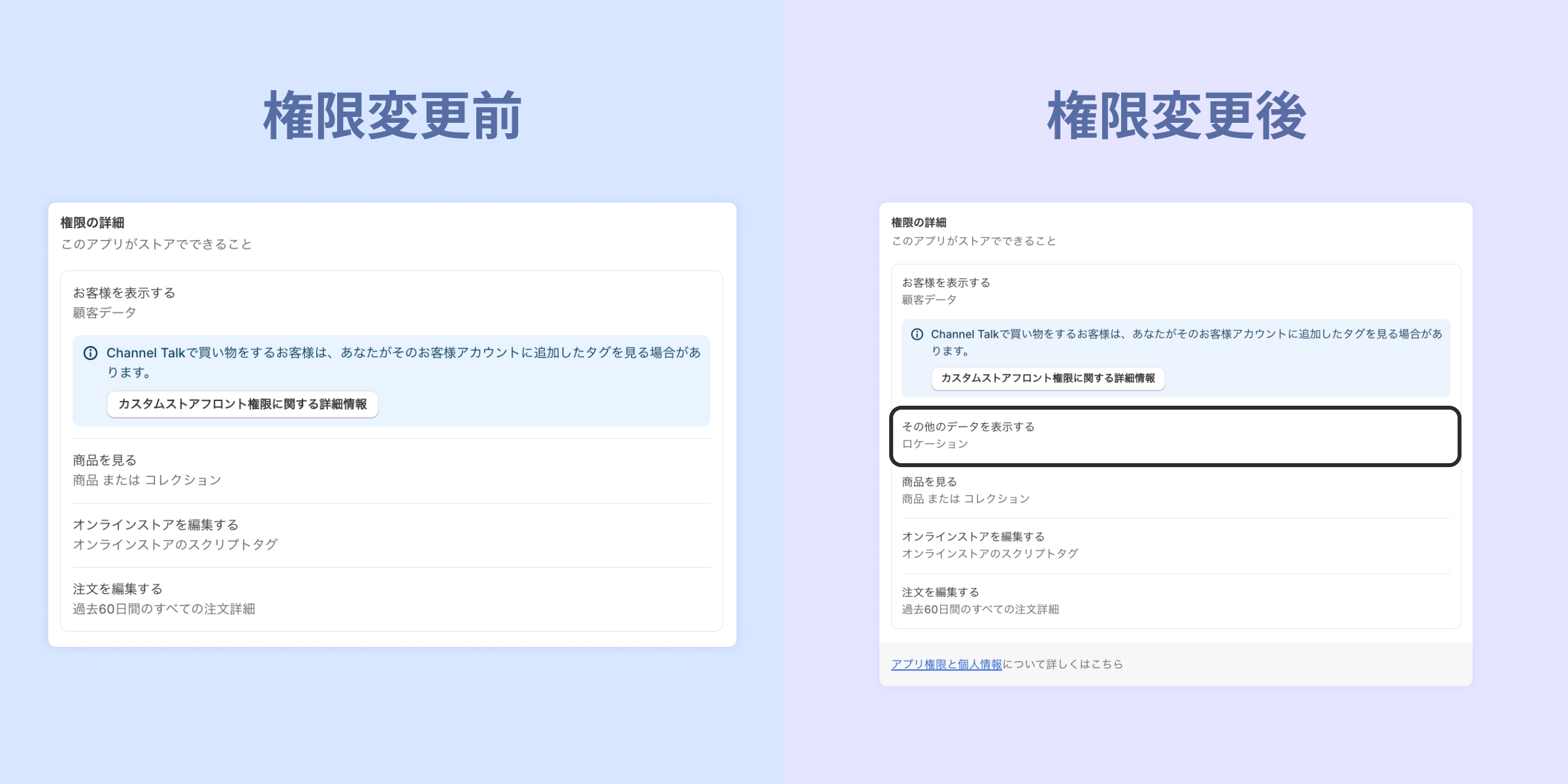変更内容:コマンドを通して顧客が注文キャンセルを実行するために、Shopifyの管理画面でチャネルトークアプリの権限の追加が必要です。