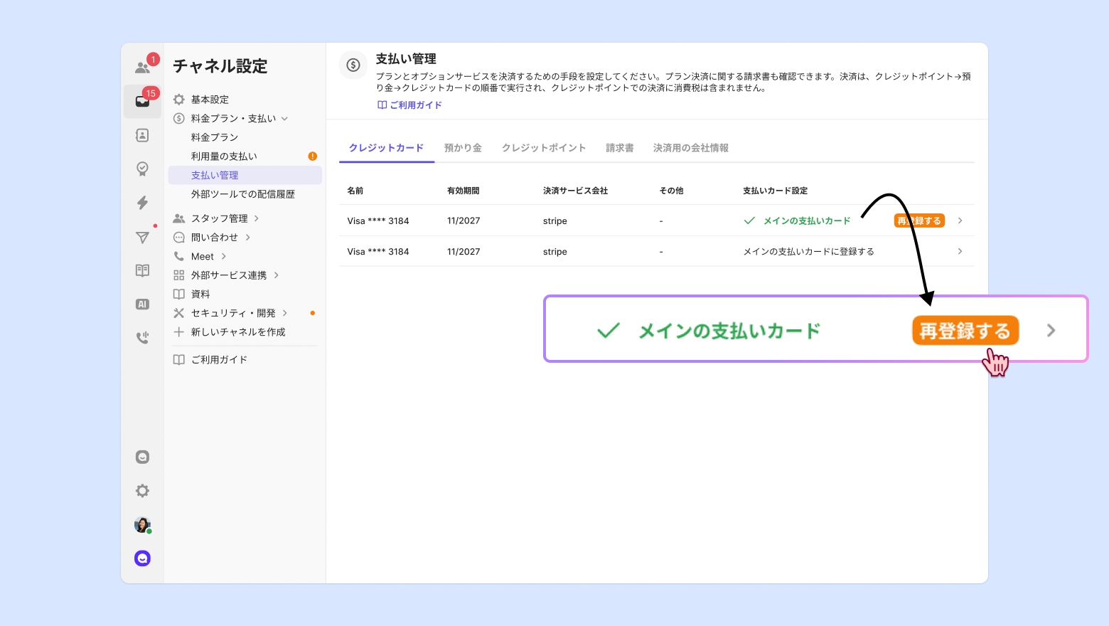 ⚙️チャネル設定>料金プラン・支払い>支払い管理>クレジットカード