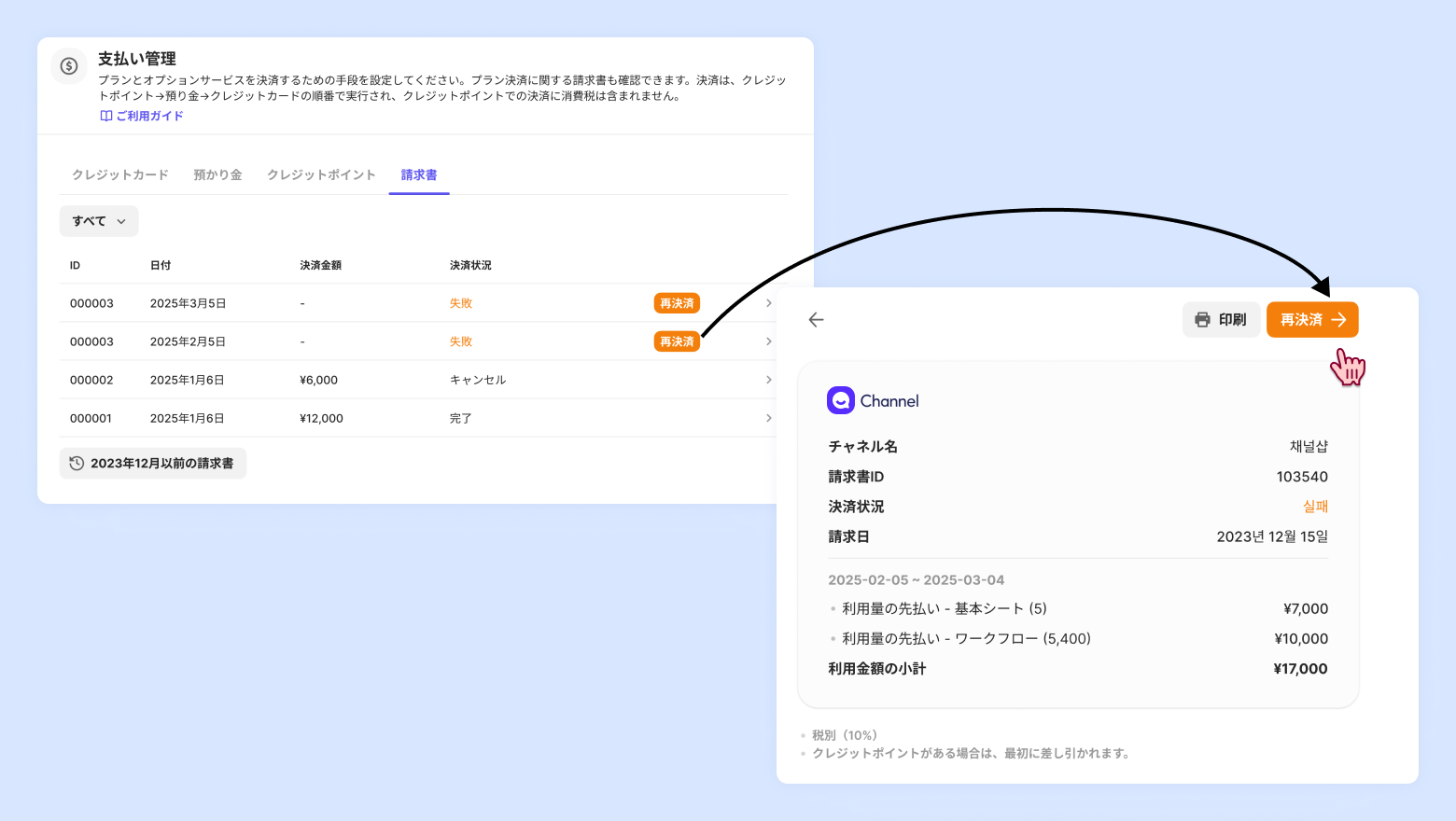 請求書の右上にある「再決済」を押して再決済を行ってください。