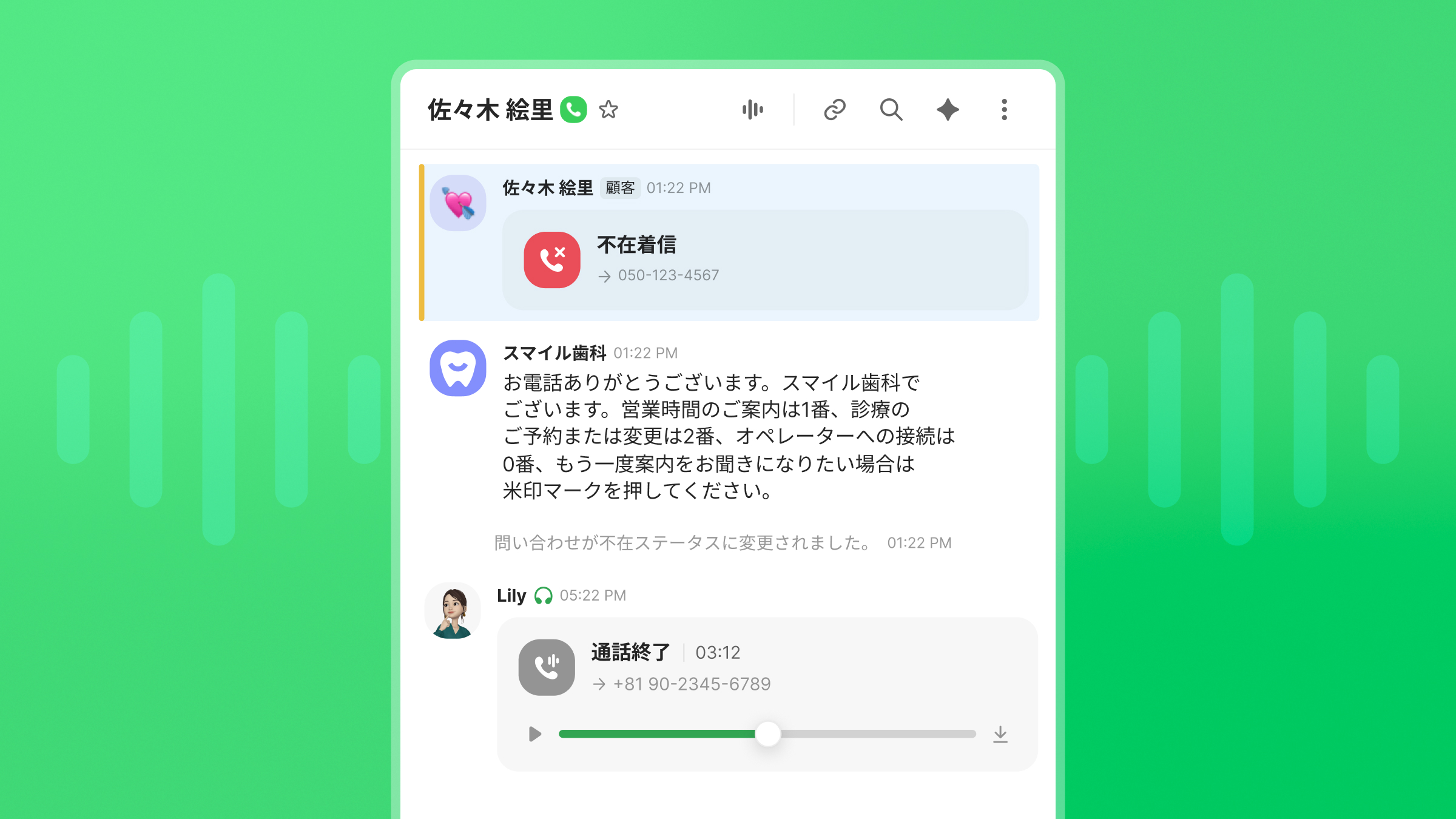 今月は業務効率を高めるアップデートをご用意しました!これまで電話をするごとにチャットルームが分かれてしまって、以前の履歴と新しい履歴を比較して確認が難しかったですが、これからは1つのチャットルームに1人の顧客との通話履歴を集積することができます👏