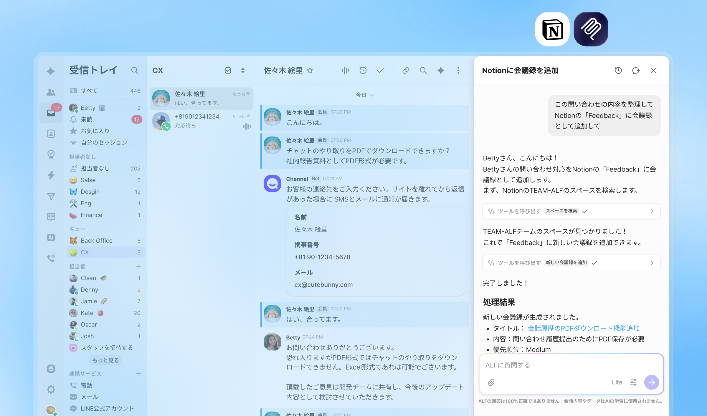 また、Notionなどの外部ツールで自社ナレッジを管理している場合、外部ツールの内容を社内ALFで活用できる「MCP連携」が可能になりました。社内ALFから連携した外部ツールに会議録などを記録することもできるので、ツール同士の行き来がより簡単になります🏃♀️
