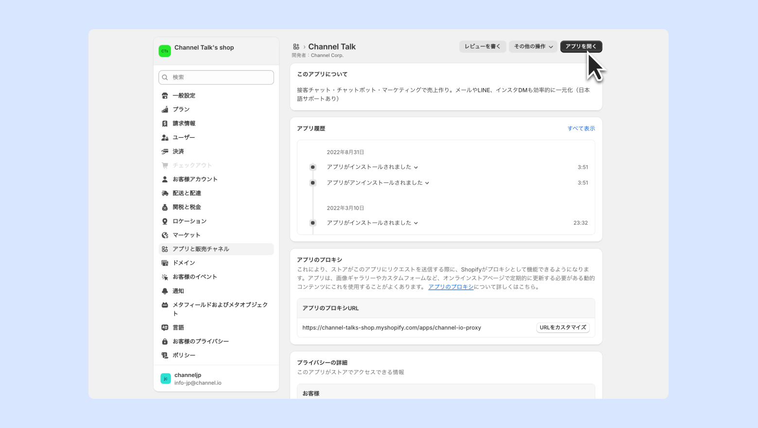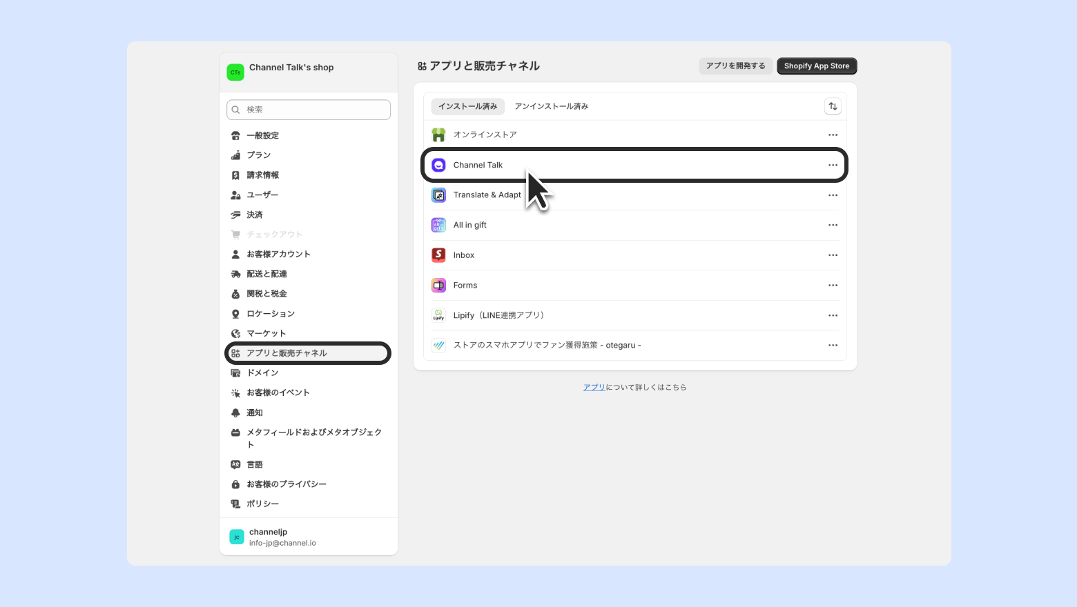 [Shopify管理画面] - [設定] - [アプリと販売チャネル] - [Channel Talk] をクリック