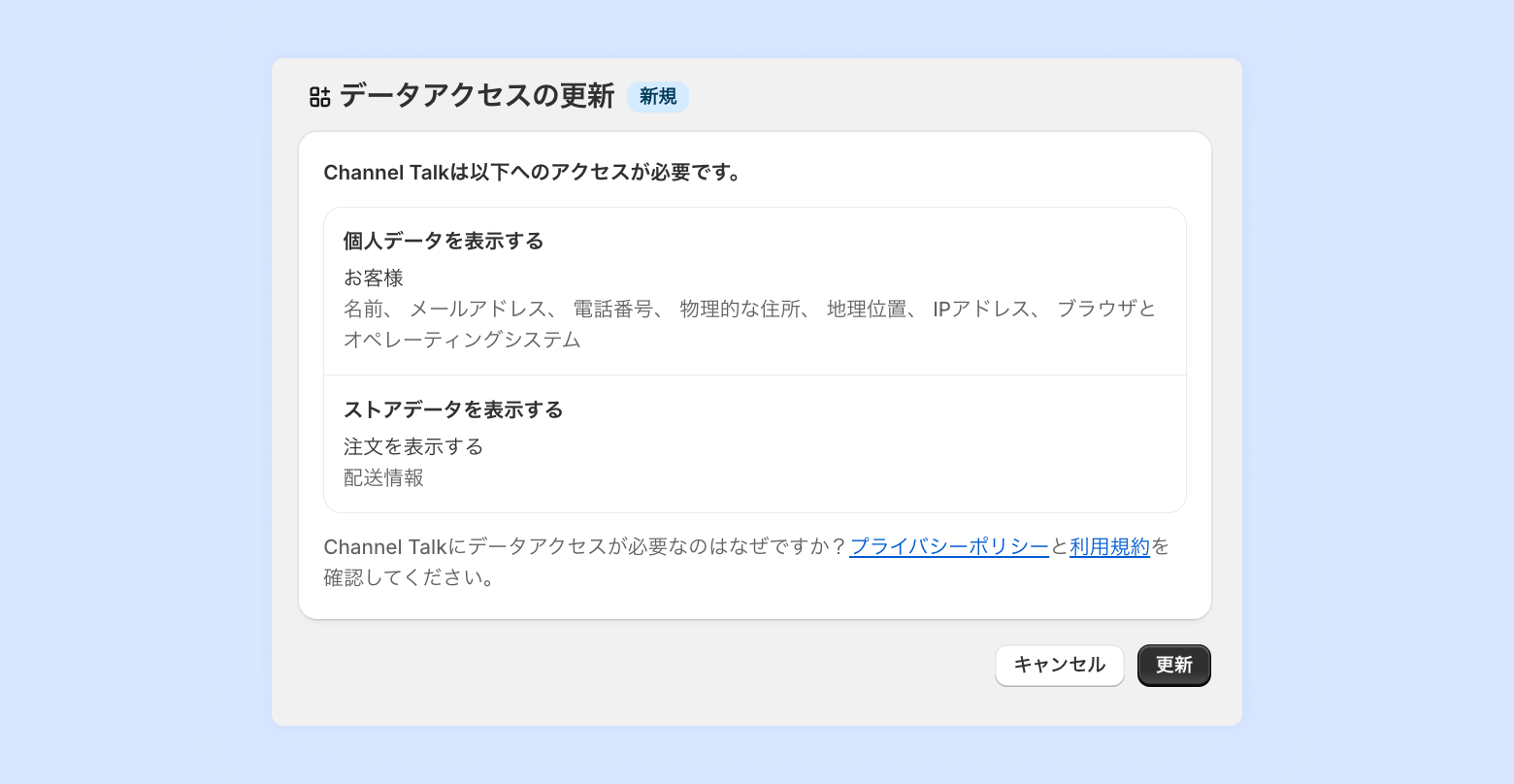 変更内容:顧客がコマンドを通じて配送先変更を実行できるようにするために、Shopifyの管理画面でチャネルトークアプリの権限変更が必要です。