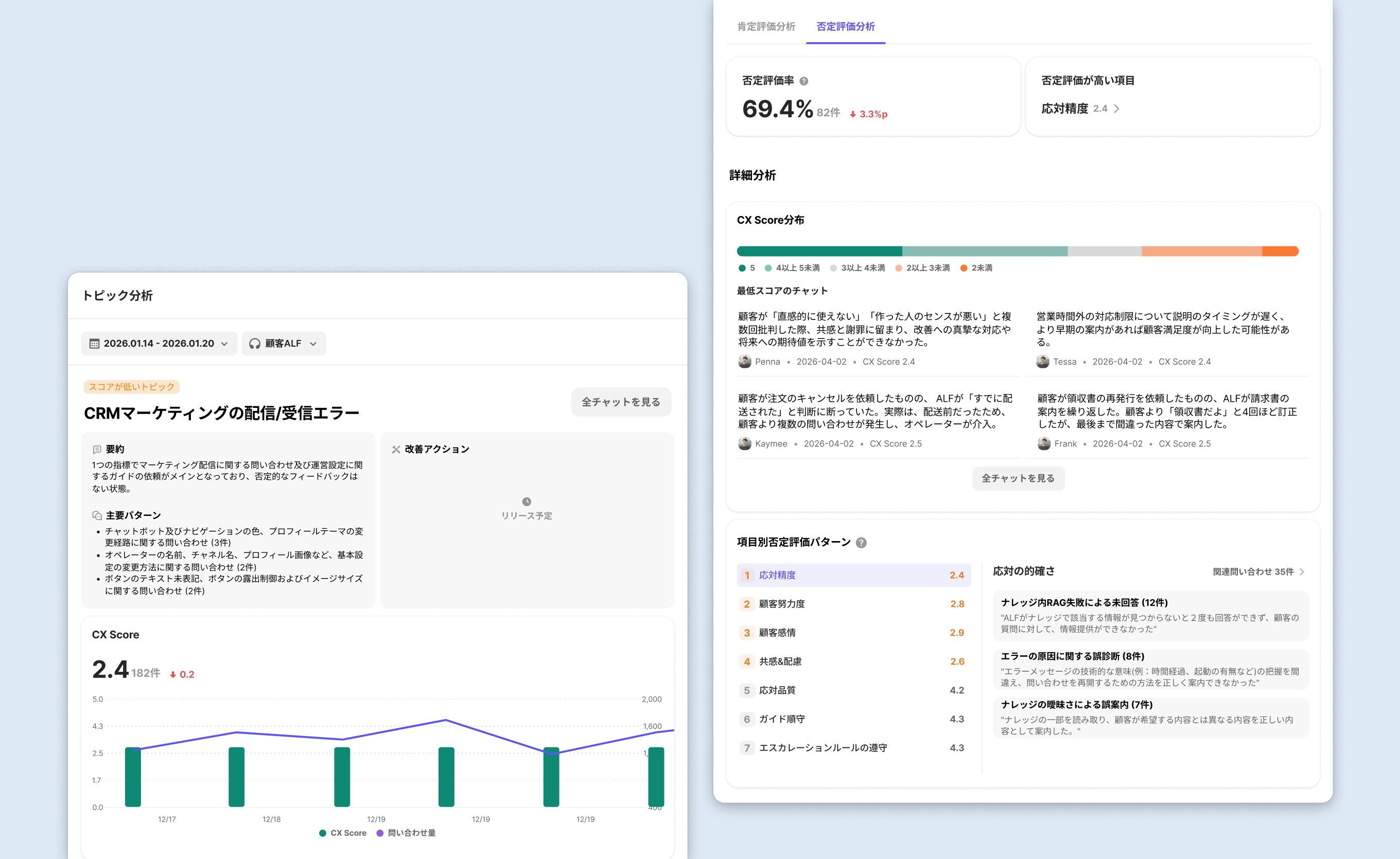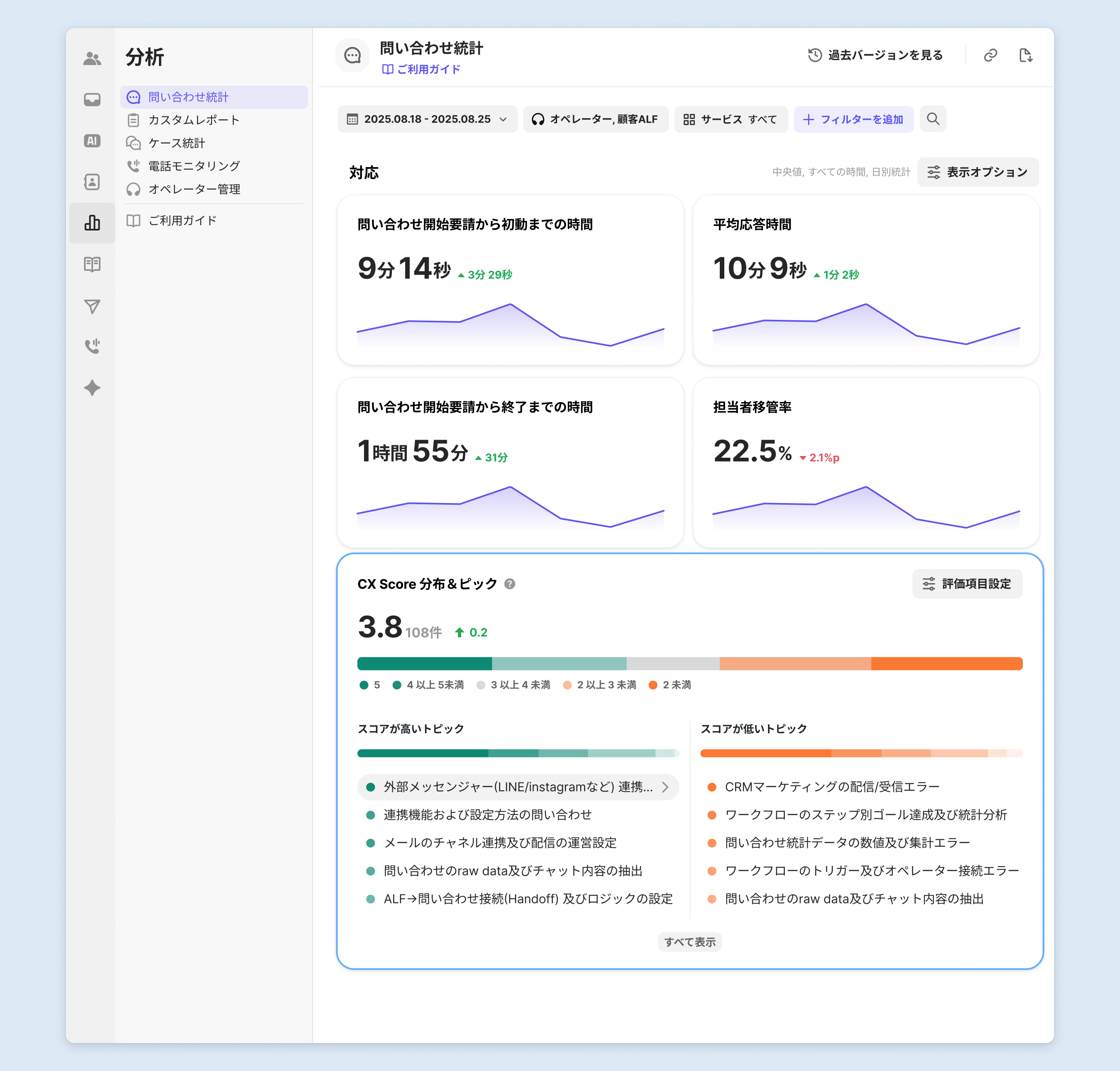 分析 - 問い合わせ統計 | 「CX Score 分布&トピック分析」を追加 | ALF応対後・オペレーター対応後の評価 |