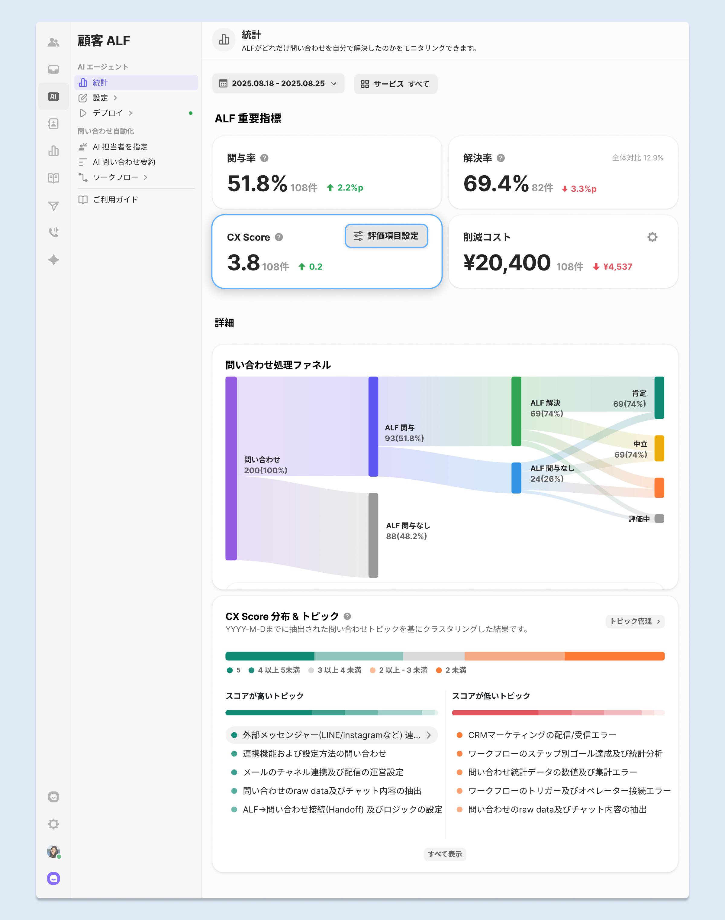 AI - 統計 | 「CX Score 分布&トピック分析」を追加 | ALF応対後の評価状況 |