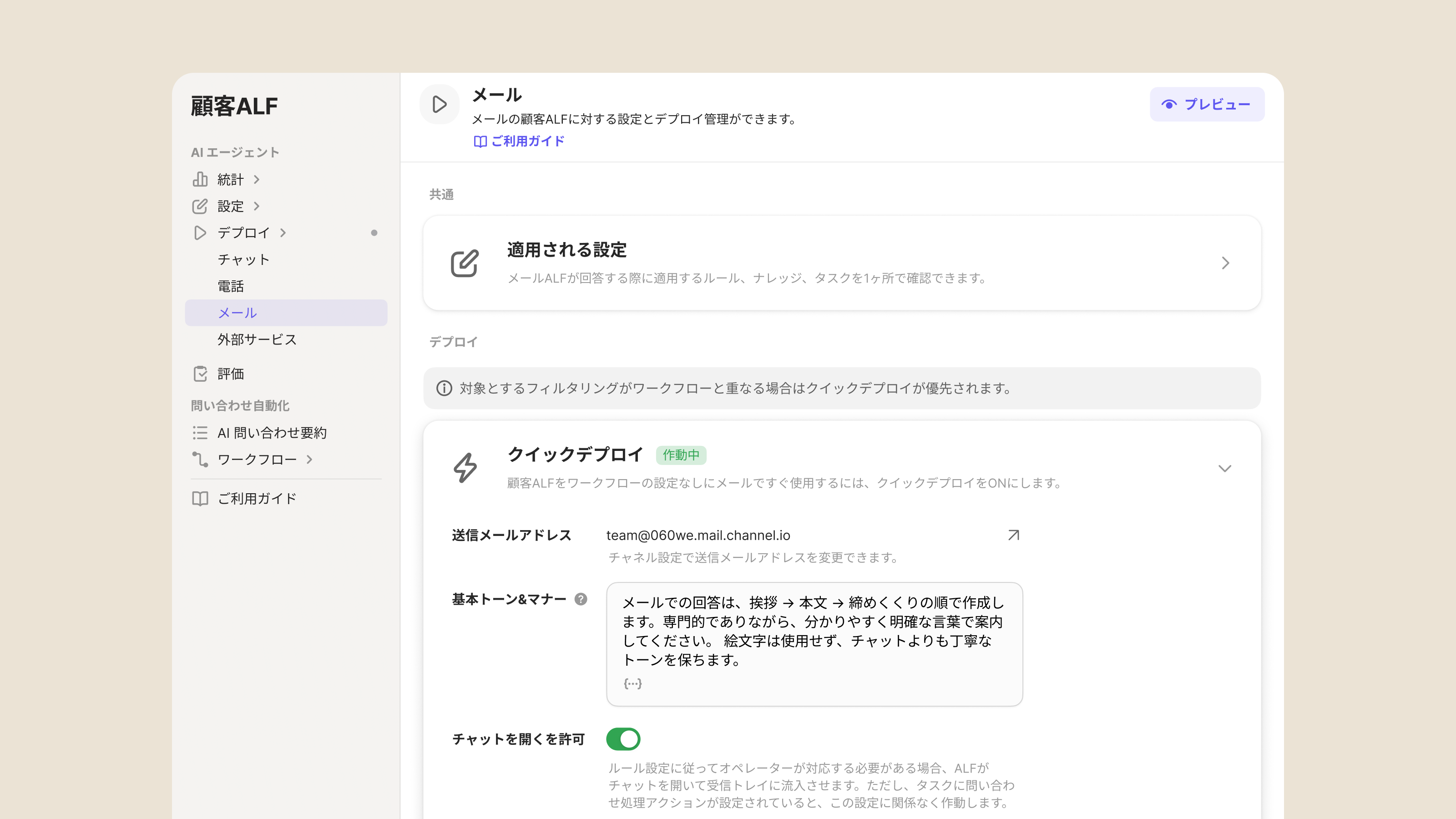 チャット・電話・外部連携メッセンジャーに加え、メールで届く顧客問い合わせにもALFが自動で回答できるようになりました。メール対応に適用されるルール、ナレッジ、タスク、ワークフローも一目で確認・活用できます。