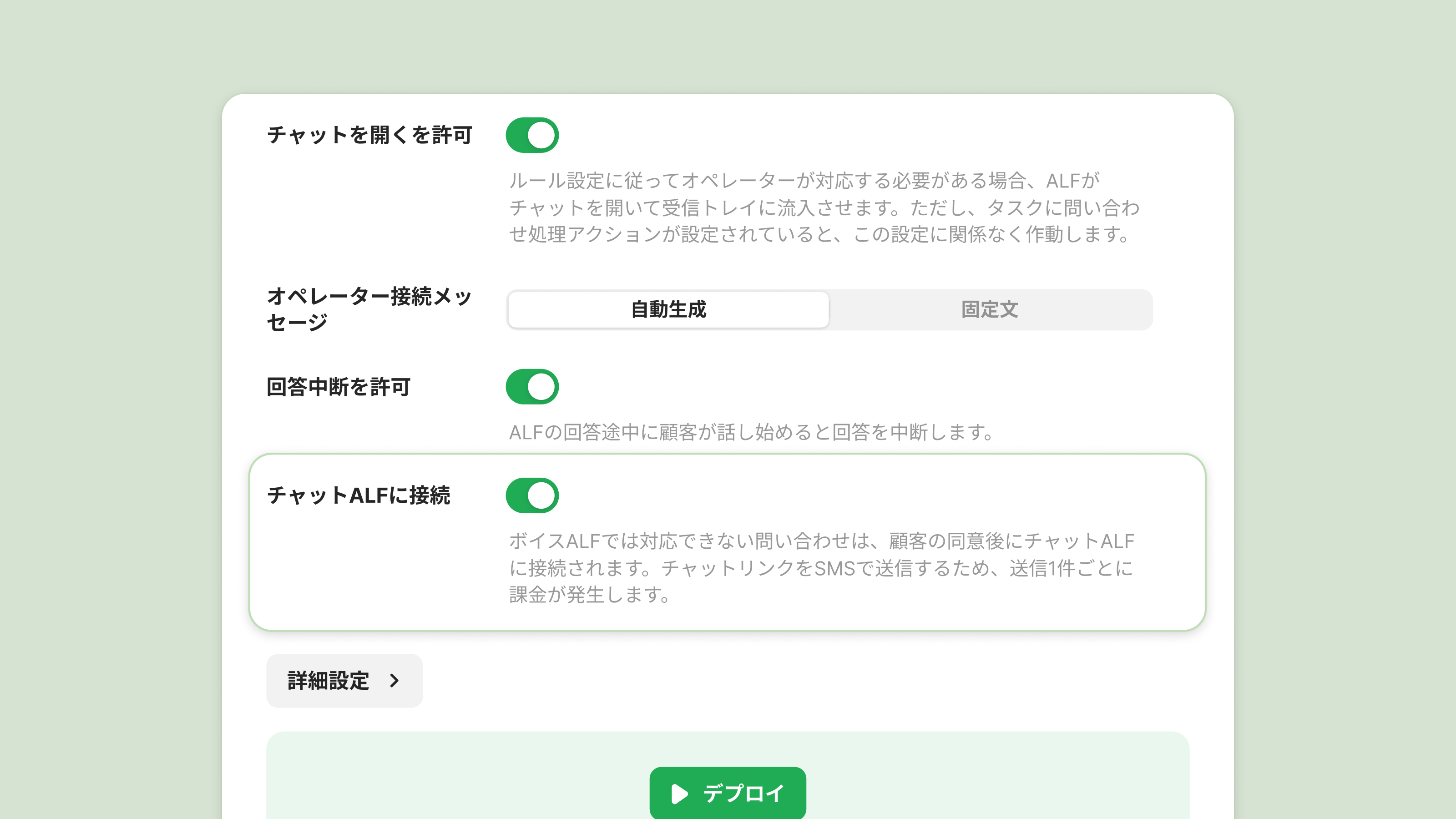 クイックデプロイ:[AI] - [デプロイ] - [電話] - [クイックデプロイ] で [チャットALF連携] をON