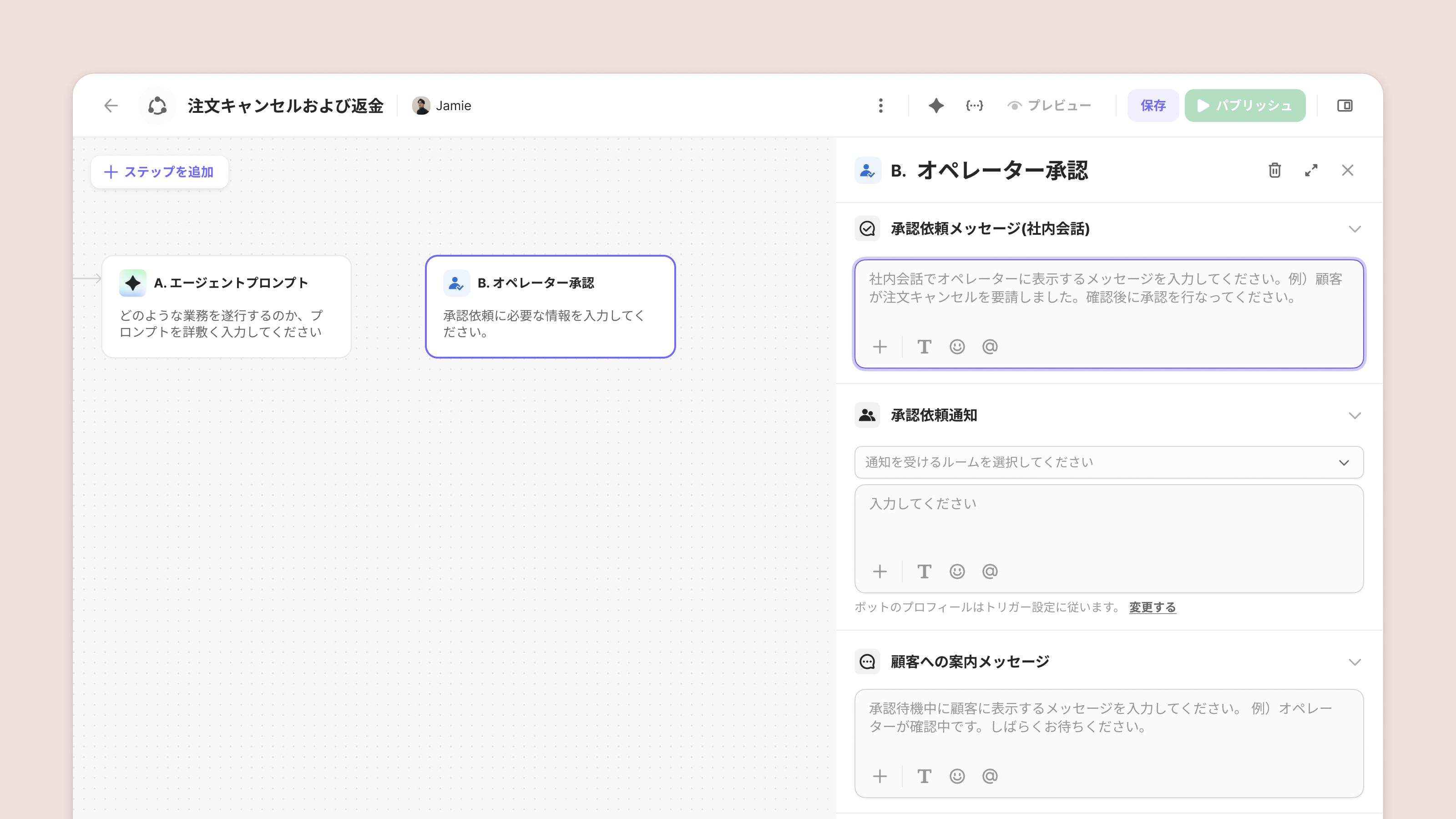 完全自動化が難しい場面でタスクを一時停止し、担当者に承認を依頼できるようになります。