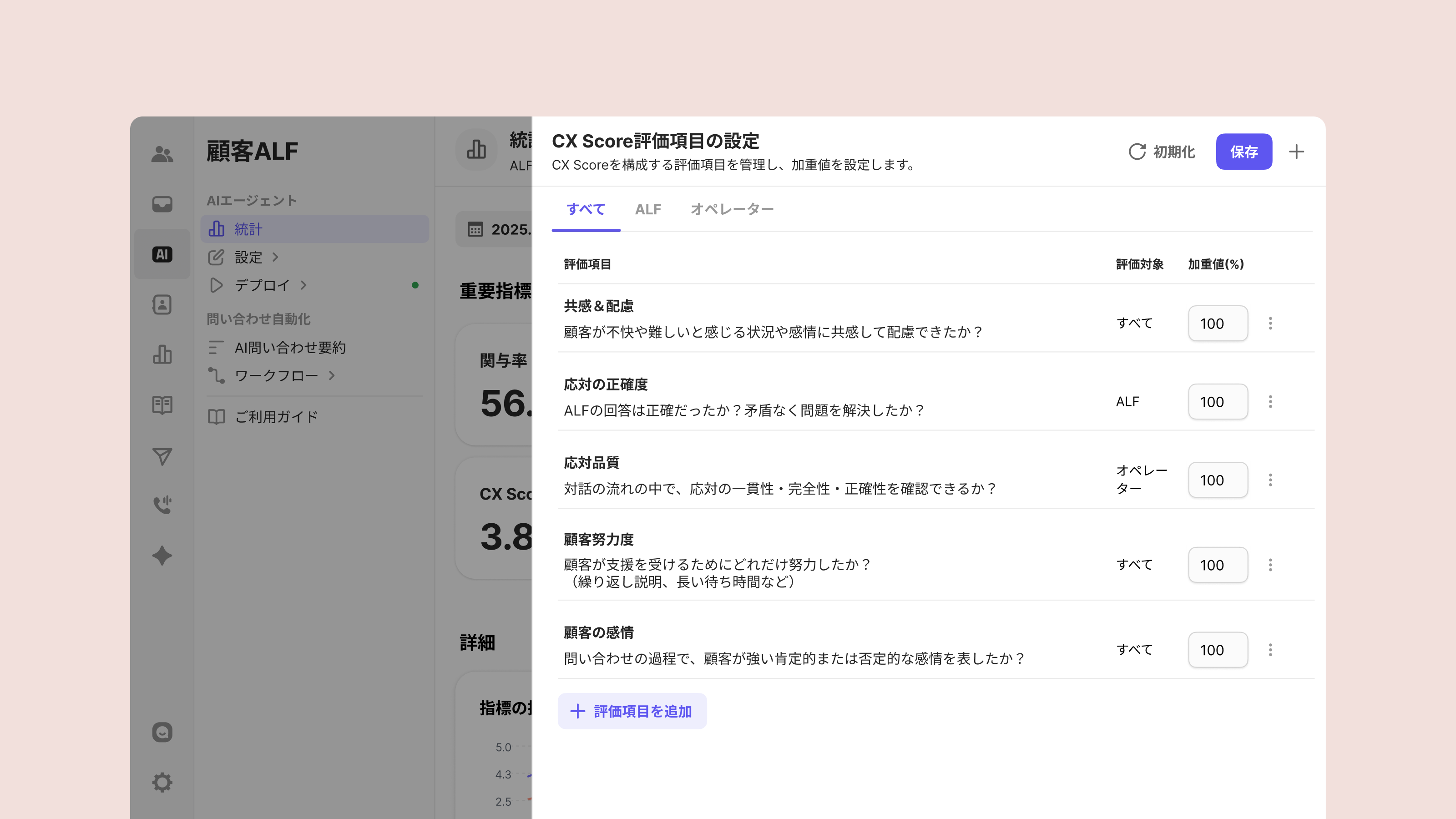 問い合わせが終了すると、AIが自動で問い合わせ品質を評価し、CX Scoreとして表示します。 共感・配慮、応対精度、顧客努力度など5つの基本指標で、ALFとオペレーターの応対を一貫した基準で測定できます。 評価基準はビジネスに合わせて直接追加・修正できるため、自社サービスに最適な問い合わせ品質の管理が可能です。