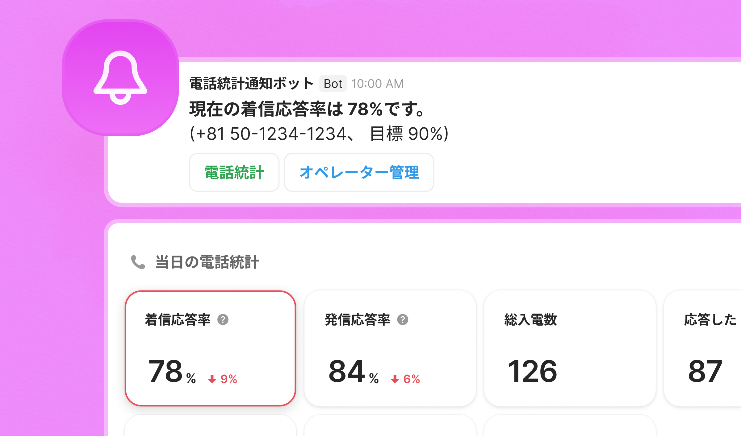 着信応答率とサービスレベルが目標値よりも低いとき、ダッシュボードが強調され、社内チャットに通知することができます📞通知が来たらリアルタイムでおかしな兆候を確認し、電話対応の品質を安定的に維持してください!(📘電話モニタリングを確認する)