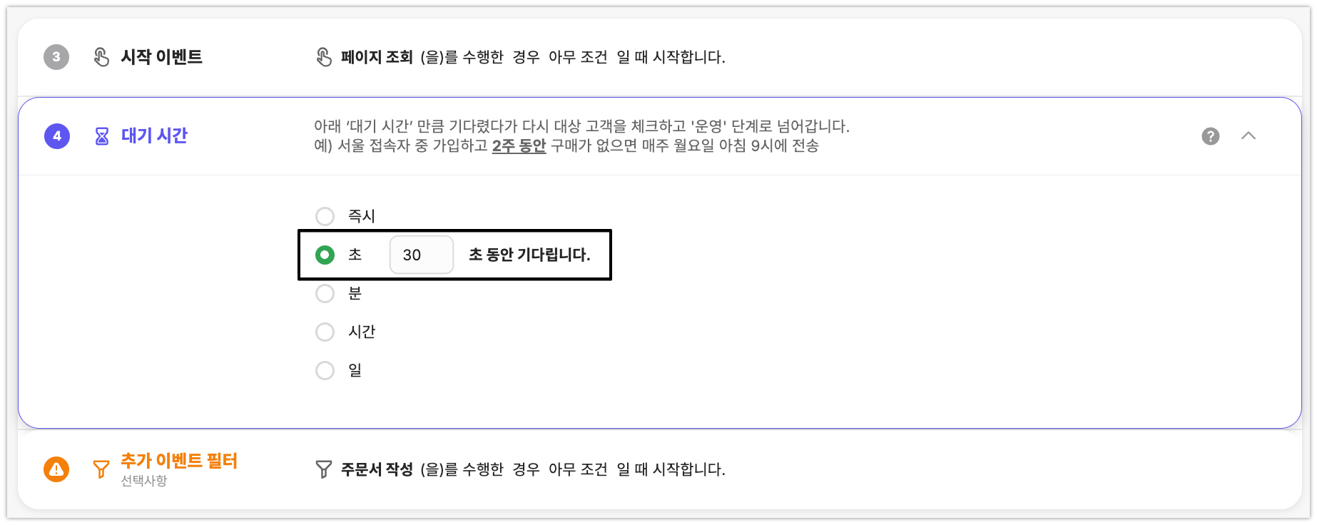 캠페인 설정 시 추가 이벤트 필터에 카페24에서 제공하는 이벤트를 사용하는 경우 '대기 시간'을 1분 미만으로 설정할 수 없게 됩니다.