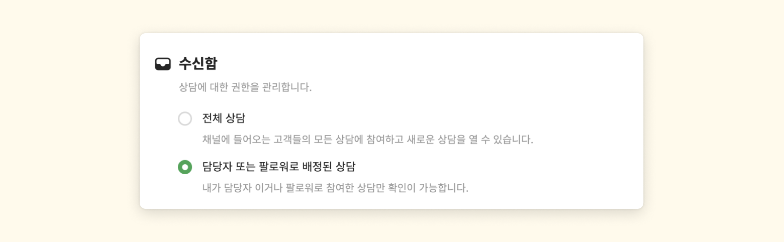대상: 수신함 권한 중 담당자 또는 팔로워로 배정된 상담 권한을 사용하는 채널