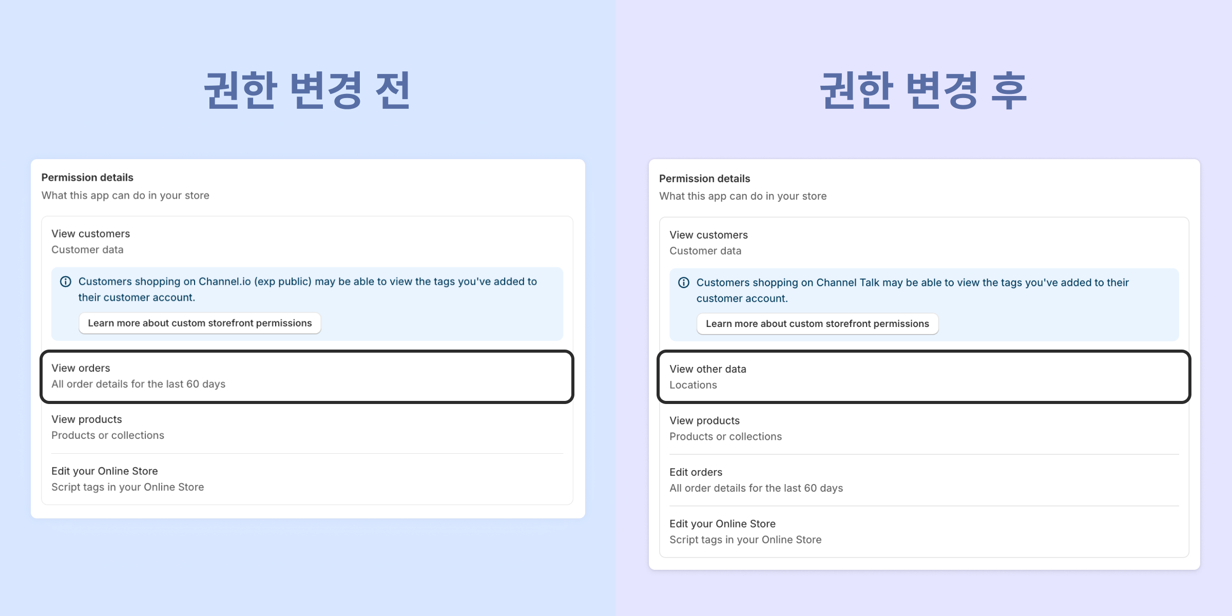 변경 내용: 커맨드를 통해 통해 고객이 주문 취소를 실행할 수 있도록 하기 위해서는 쇼피파이 관리자 페이지에서 채널톡 앱의 권한 변경이 필요합니다.