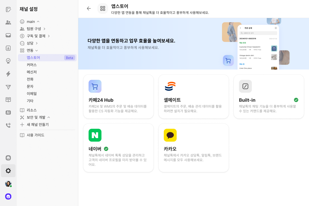 변경 후 경로: 채널 설정 - 연동 - 앱스토어