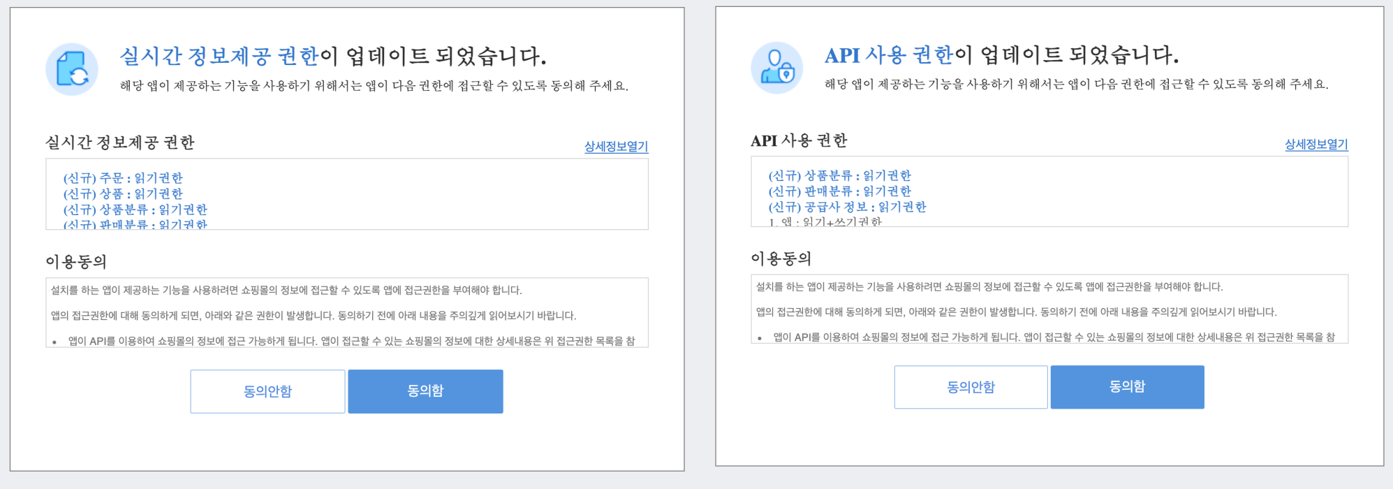 관리하기 클릭 시 보여지는 권한 업데이트를 동의해주세요.