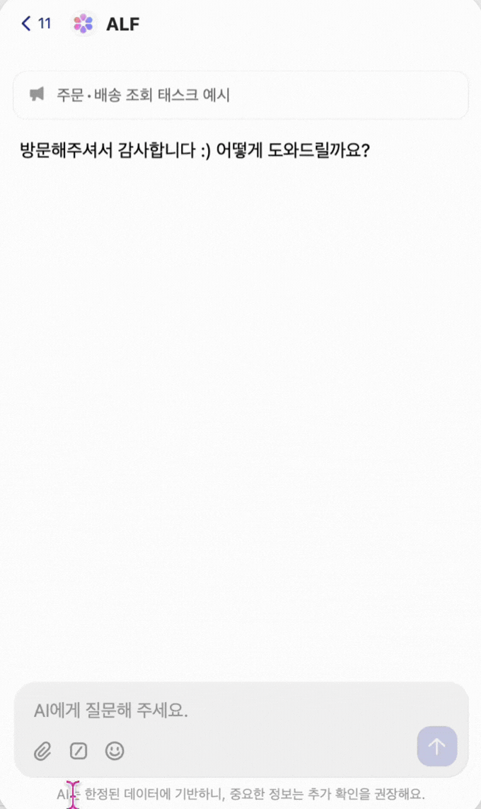 활성화 이후에는 고객이 "제 주문은 지금 어떤 상태인가요?", "언제 배송되나요?"처럼 문의할 때, ALF가 카페24 시스템을 직접 조회해 주문 및 배송상태를 정보를 고객에게 바로 안내합니다.