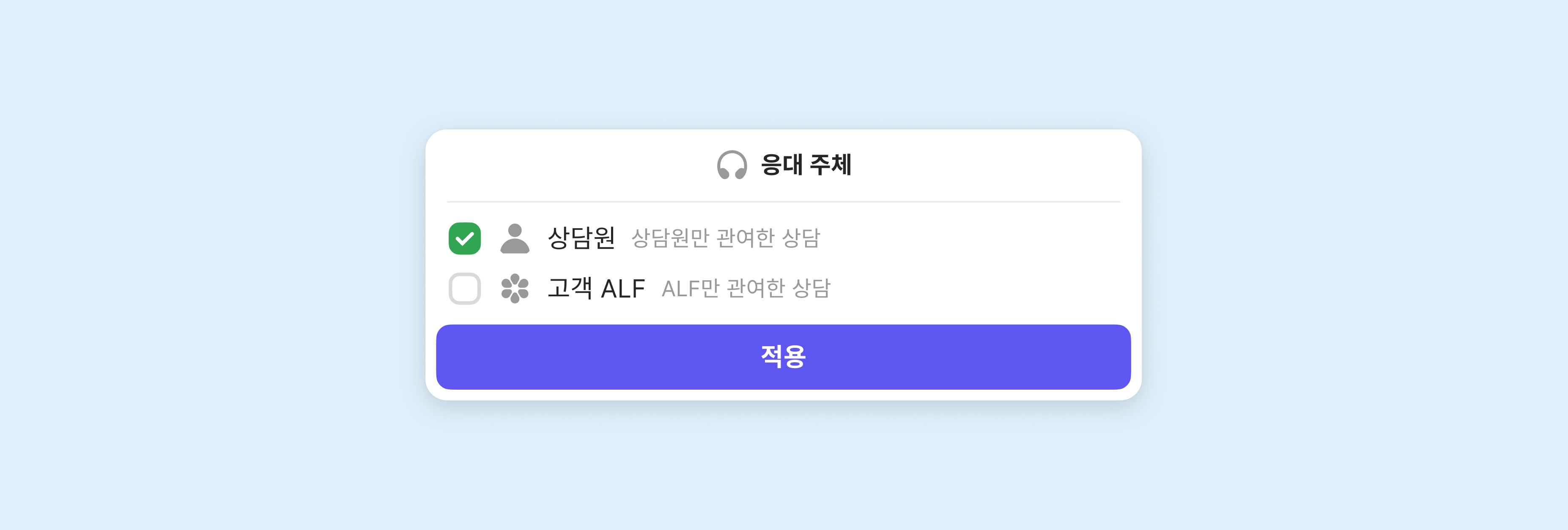 ALF가 응대한 상담도 상담 통계로 집계되며, 응대 주체 필터링이 함께 제공되어 'ALF 상담', '상담원 상담'을 필터로 구분하여 각각 확인하는 것이 가능합니다.