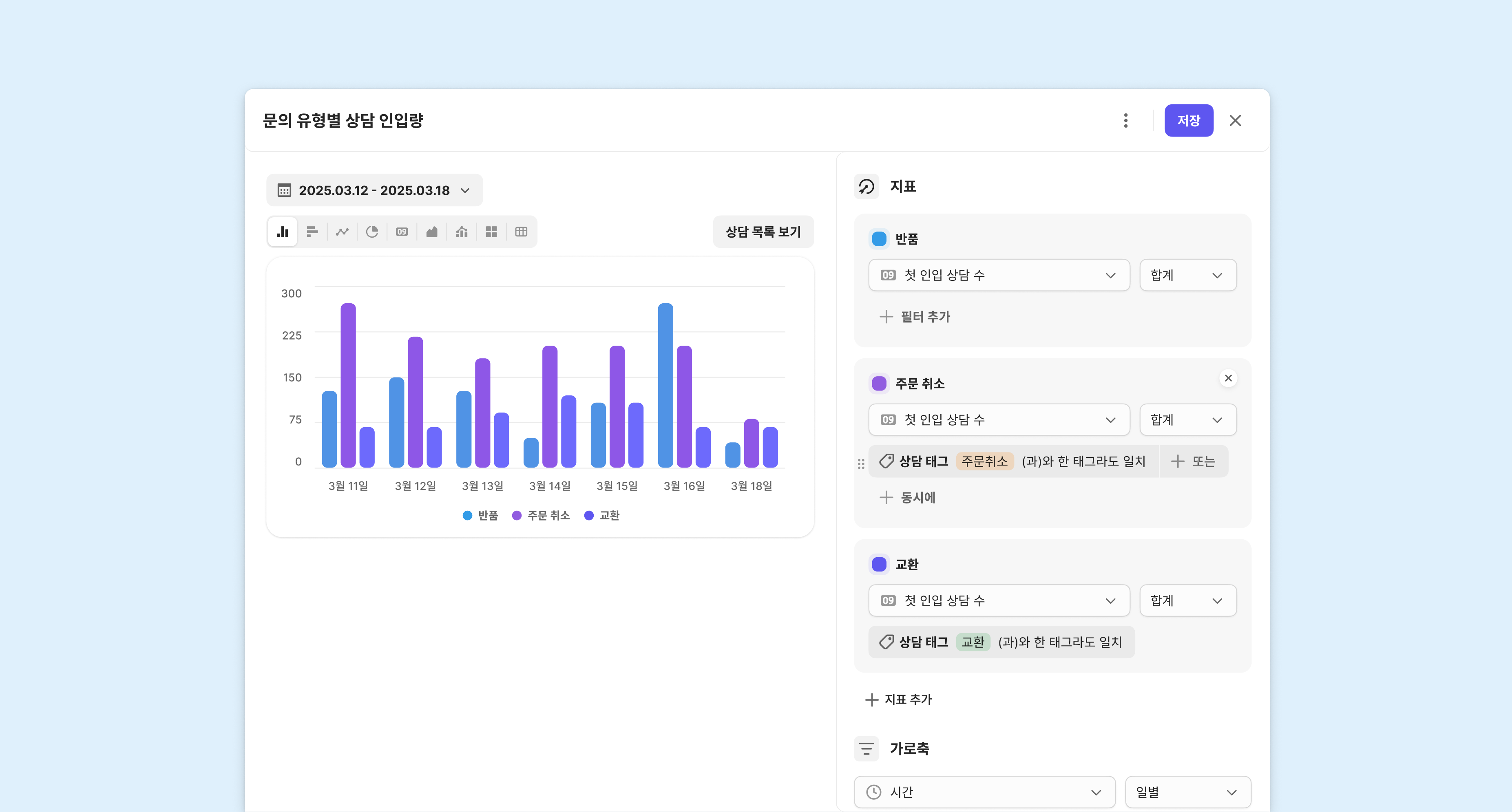 시간 및 요일 필터링 조건이 상담 인입/상담원 응대/상담 종료로 세분화됩니다.