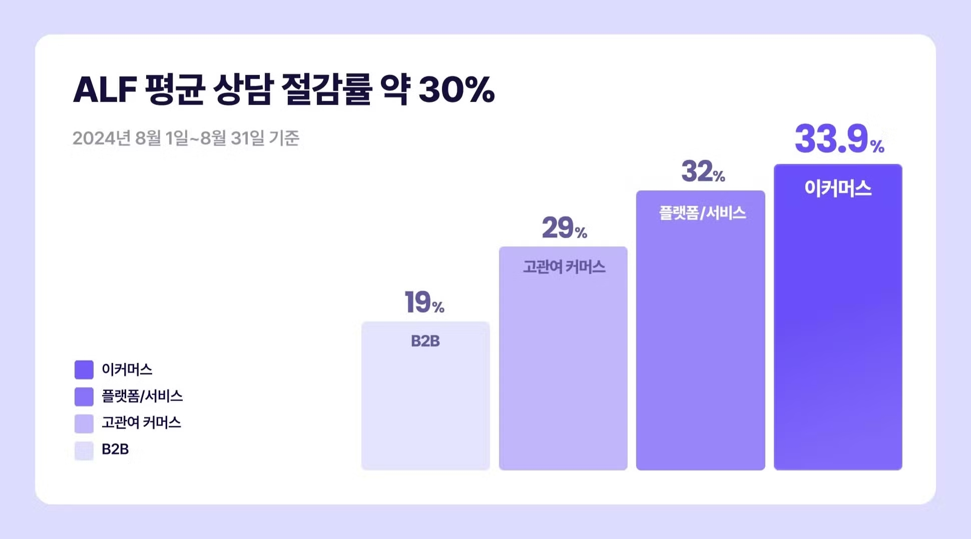 ALF는 매주 2만 건 이상의 상담을 응대하고 있으며, 그 중 약 30%를 상담사 연결 없이 혼자 처리하고 있습니다. 버티컬별로 살펴보면 단순문의가 많은 이커머스 업종이 약 34%로 가장 높은 절감률을 보였습니다. 또한 문의 유형이 다양하고 복잡한 B2B 업종에서도 절감률 약 19%로 ALF가 효과를 톡톡히 낼 수 있다는 것이 입증되었습니다.