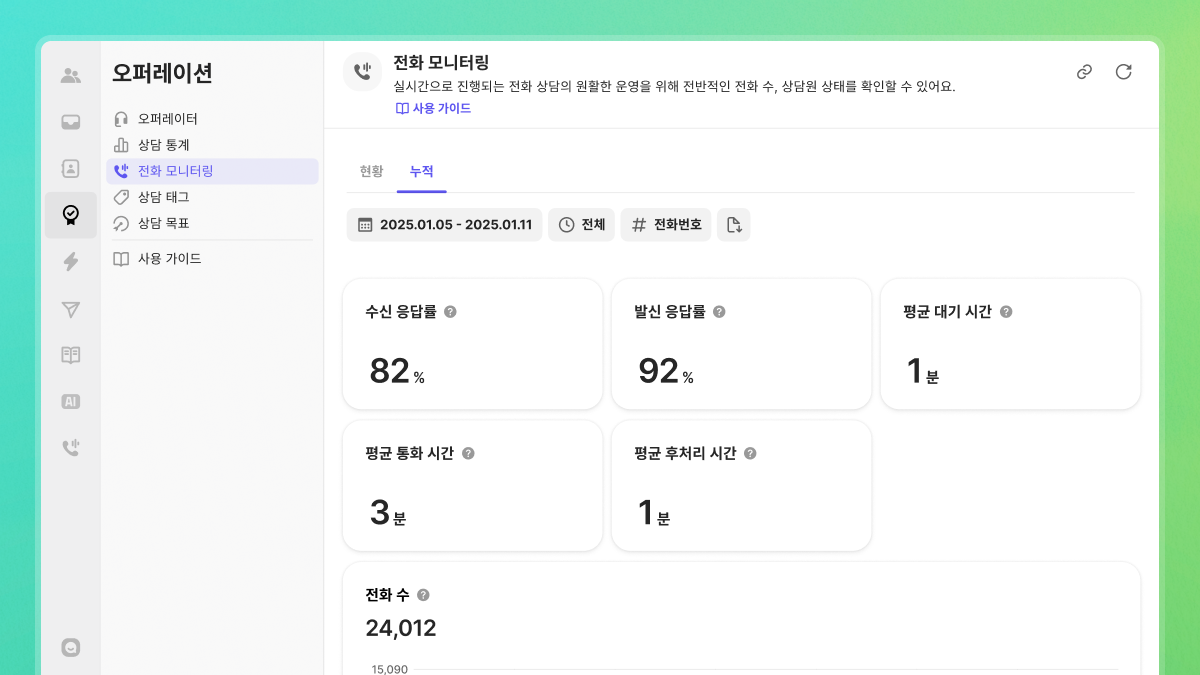 이제 응답률, 평균 대기 시간 등 중요한 전화 통계 데이터는 [오퍼레이션] - [전화 모니터링] - [누적]에서 가공없이 바로 확인할 수 있어요.