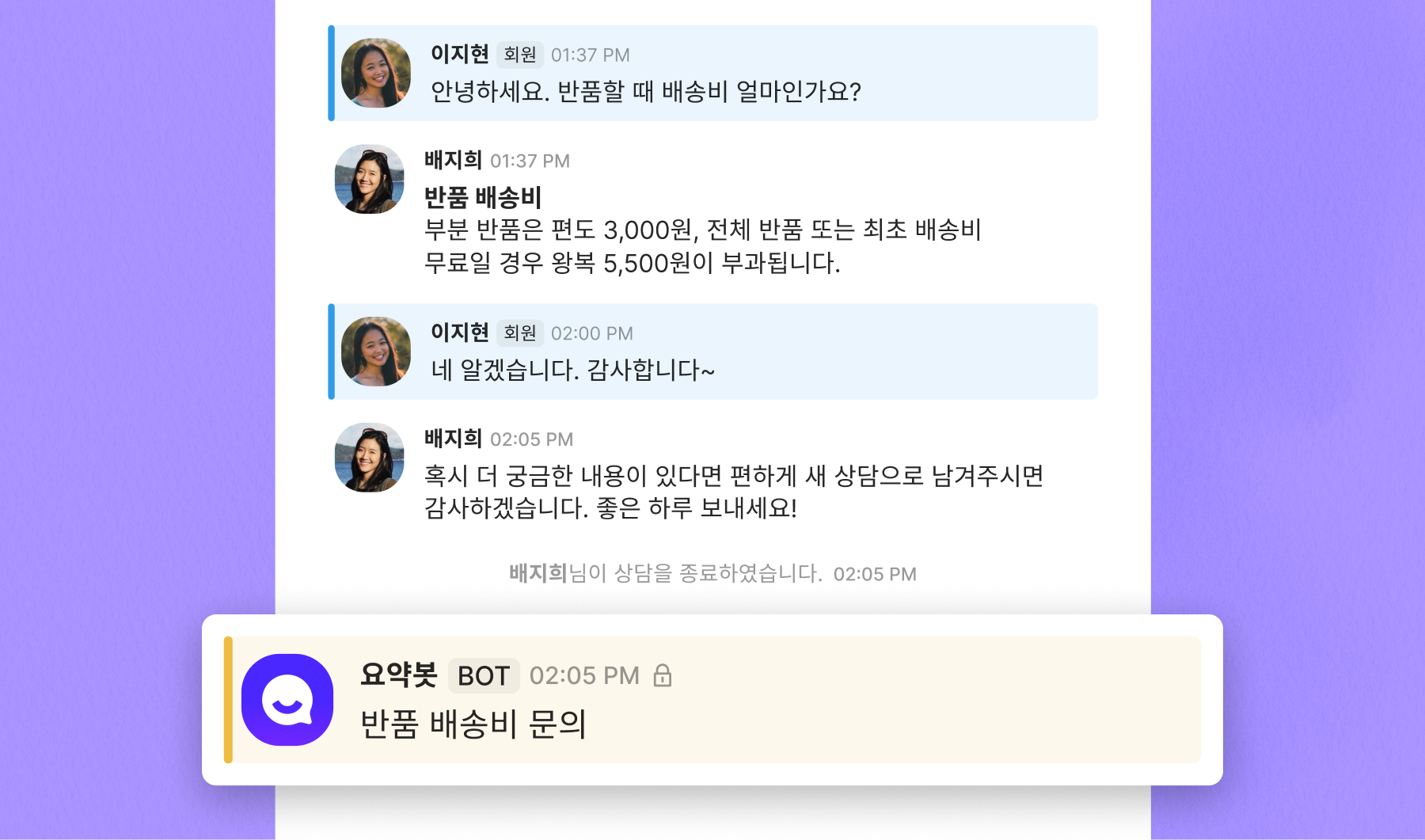 상담을 종료하거나 보류할 때 AI가 상담 내용을 자동으로 요약해 내부 대화로 저장합니다. 상담 이력 파악이 쉬워지고, 후처리 시간을 절약할 수 있어요. 요약된 내용은 상담 통계로 다운로드도 가능하며 원하는 요약 형식을 직접 지정할 수도 있어요. 상담 요약 기능은 유료 플랜에서 추가 비용 없이 제공되니 꼭 활용해 보세요!(→ 더 알아보기)