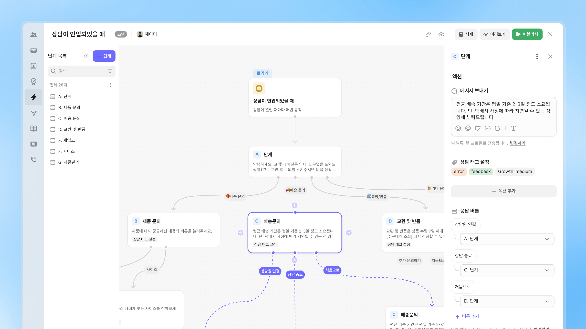 이번 에디터 v2에서는 한눈에 단계 흐름을 파악하고 쉽게 흐름을 구성할 수 있도록 인터페이스 전반을 다듬었어요. 특히 드래그 앤 드롭 방식으로, 단계를 배치하고 연결하는 과정이 훨씬 편해진 걸 느끼실 수 있을 거예요. 또한 작업 중 실수해도 되돌리기 기능과 강화된 에러 안내 덕분에 안심하고 조작할 수 있어요.