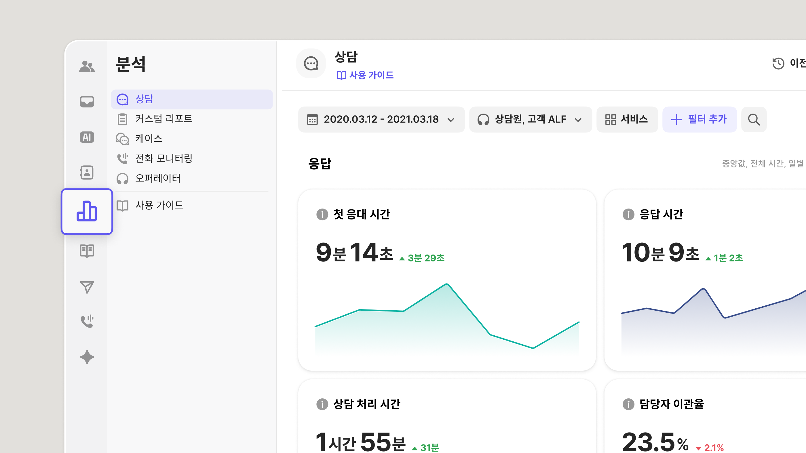 커스텀 리포트 출시와 함께 기존 상담별 통계도 업그레이드 됩니다. ALF 상담을 포함해 상담 전반의 흐름과 결과를 더 직관적으로 확인할 수 있어요.