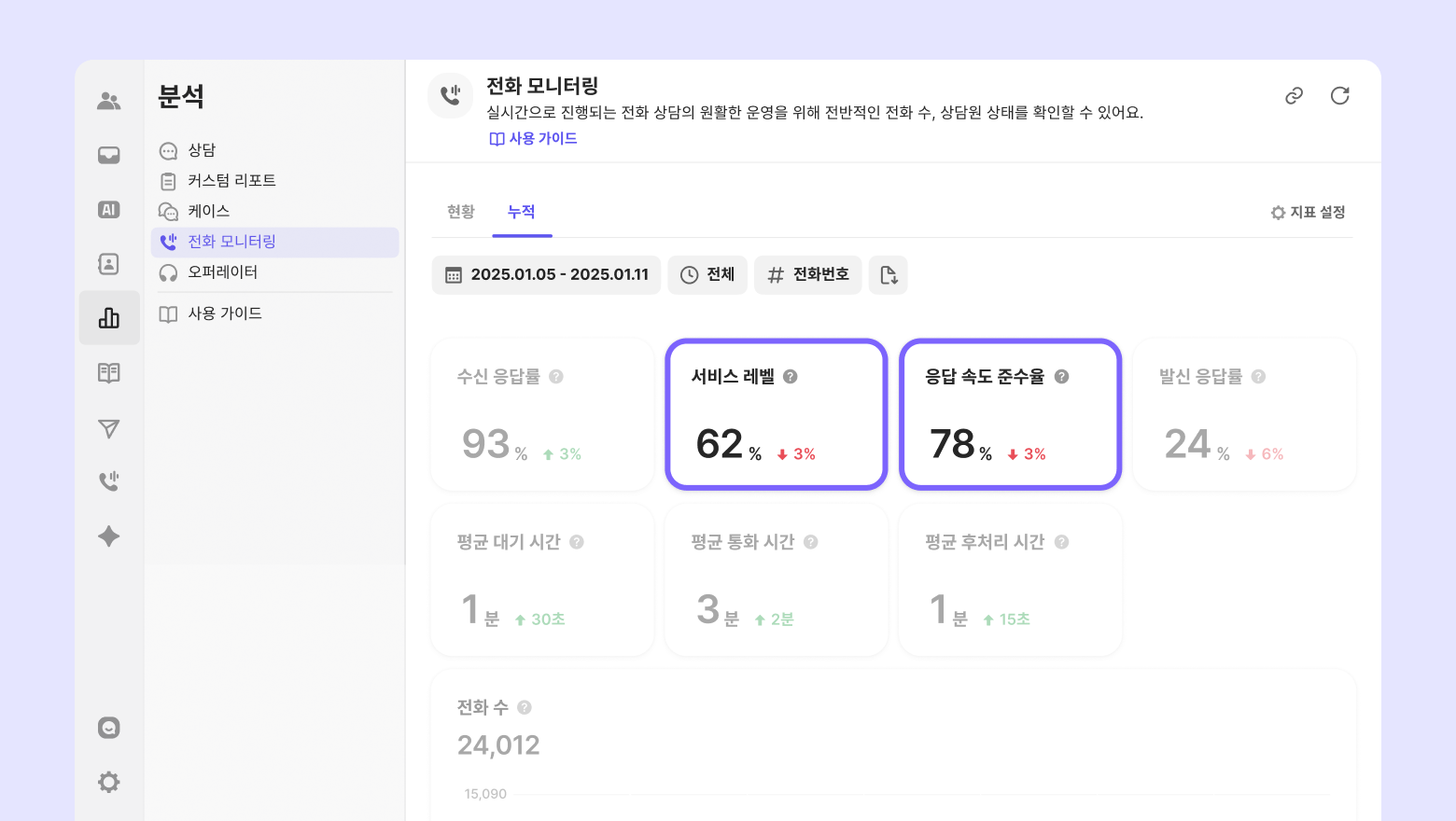 기존 서비스 레벨: 팀 멤버에게 링이 울린 시점부터 전화를 받기까지의 시간이 N초 이내인 콜의 비율