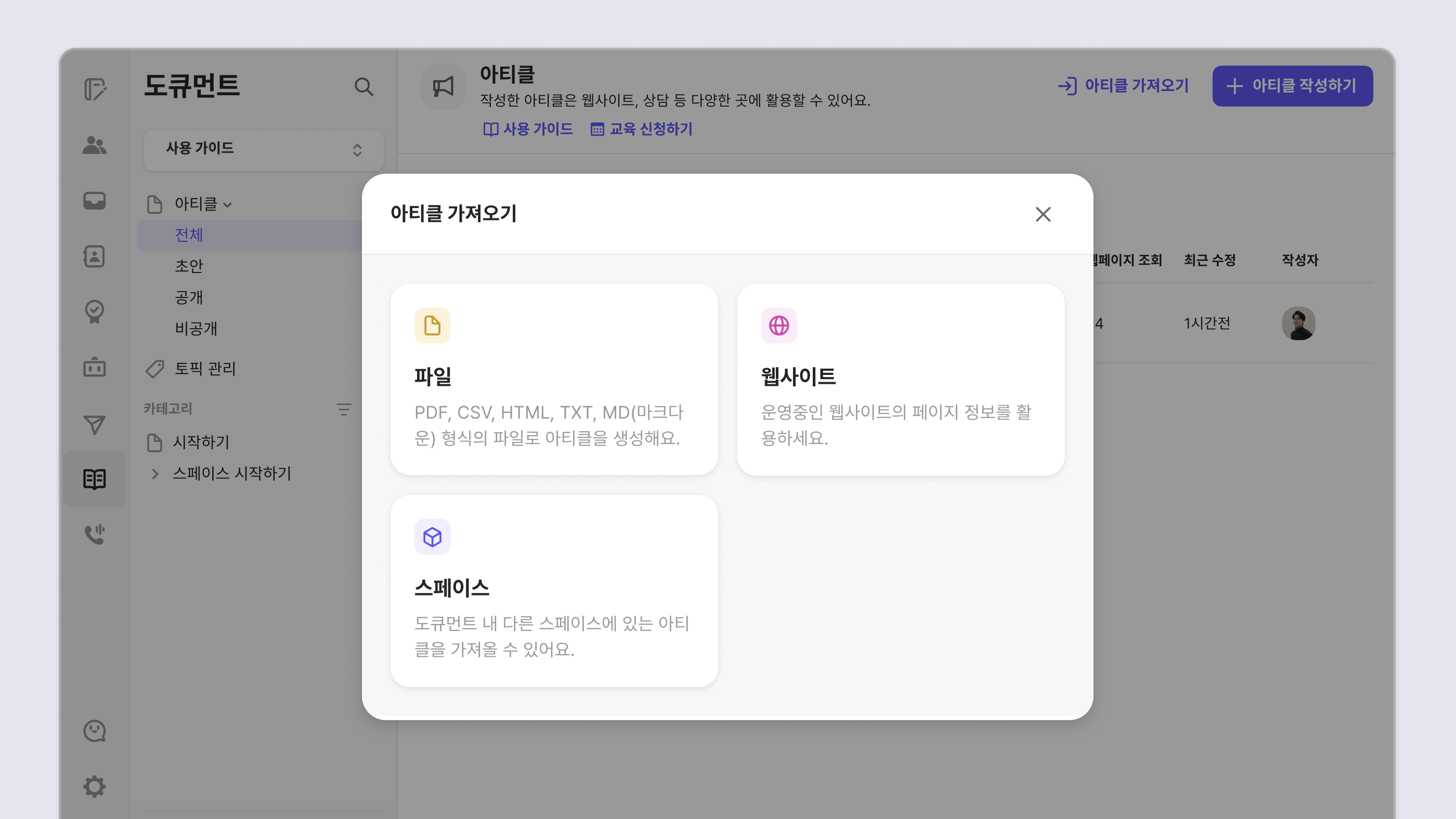 아티클 가져오기 기능이 한층 강력해졌어요. 이제 다른 스페이스의 아티클은 물론, PDF 파일까지 아티클로 가져올 수 있습니다. 기존에 PDF로 관리하던 가이드 문서가 있다면 아티클로 등록해 보세요. 내용 수정이 필요할 때 아티클 하나만 편집하면 되니 관리가 훨씬 편해집니다.