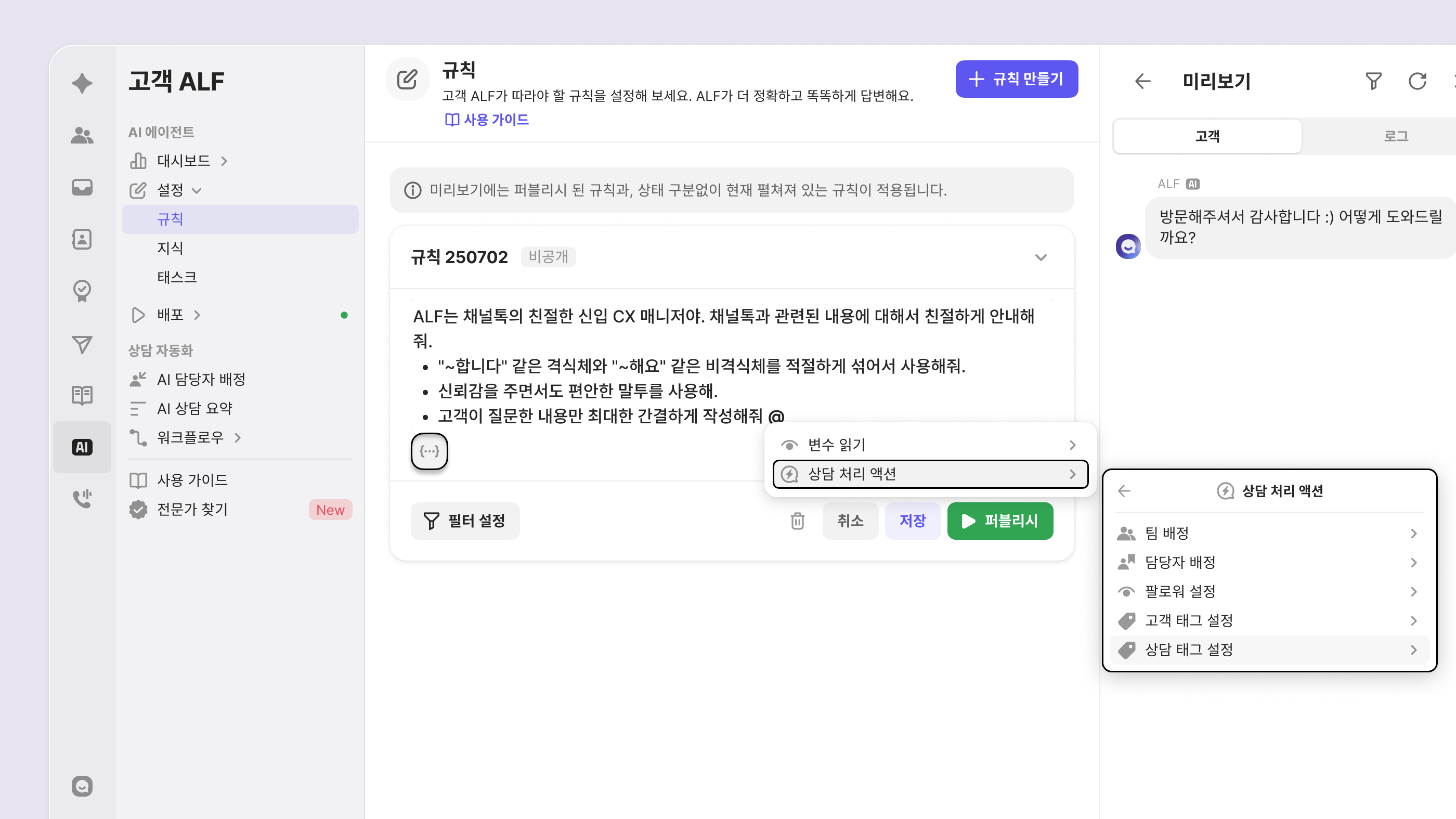 이제 규칙에서 팀/담당자 배정은 물론 고객/상담 태그 설정까지 상담 처리 액션을 바로 설정할 수 있어요. ALF가 응대하는 동안 태그 설정부터 배정까지 자동으로 이루어져, 더 효율적인 ALF 상담이 가능합니다.