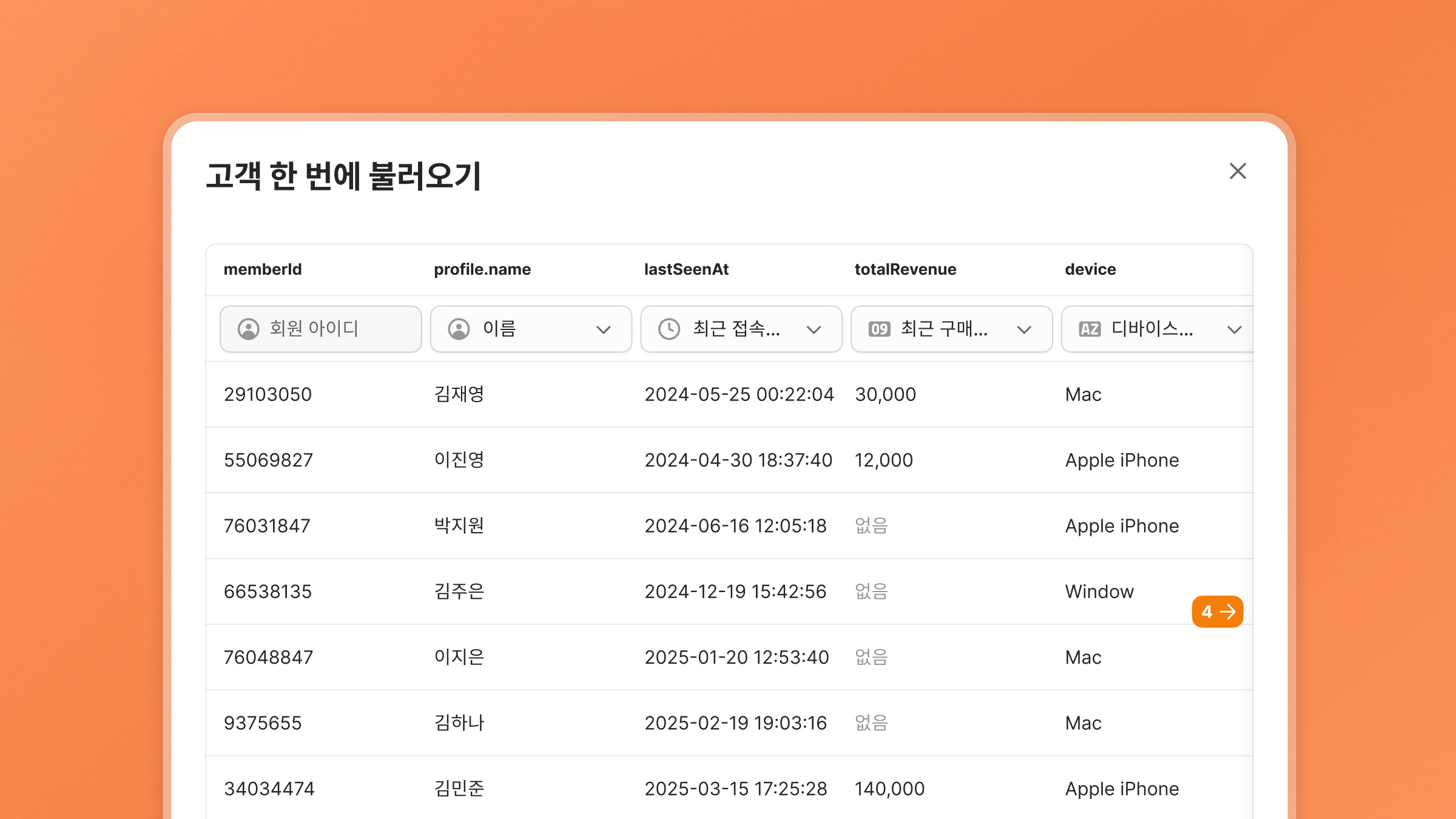 채널톡에 없는 기존 회원 불러오기부터, 오프라인에서 수집한 리드를 등록하고, 연동되지 않은 고객 속성 데이터까지 한 번에 밀어넣을 수 있습니다.