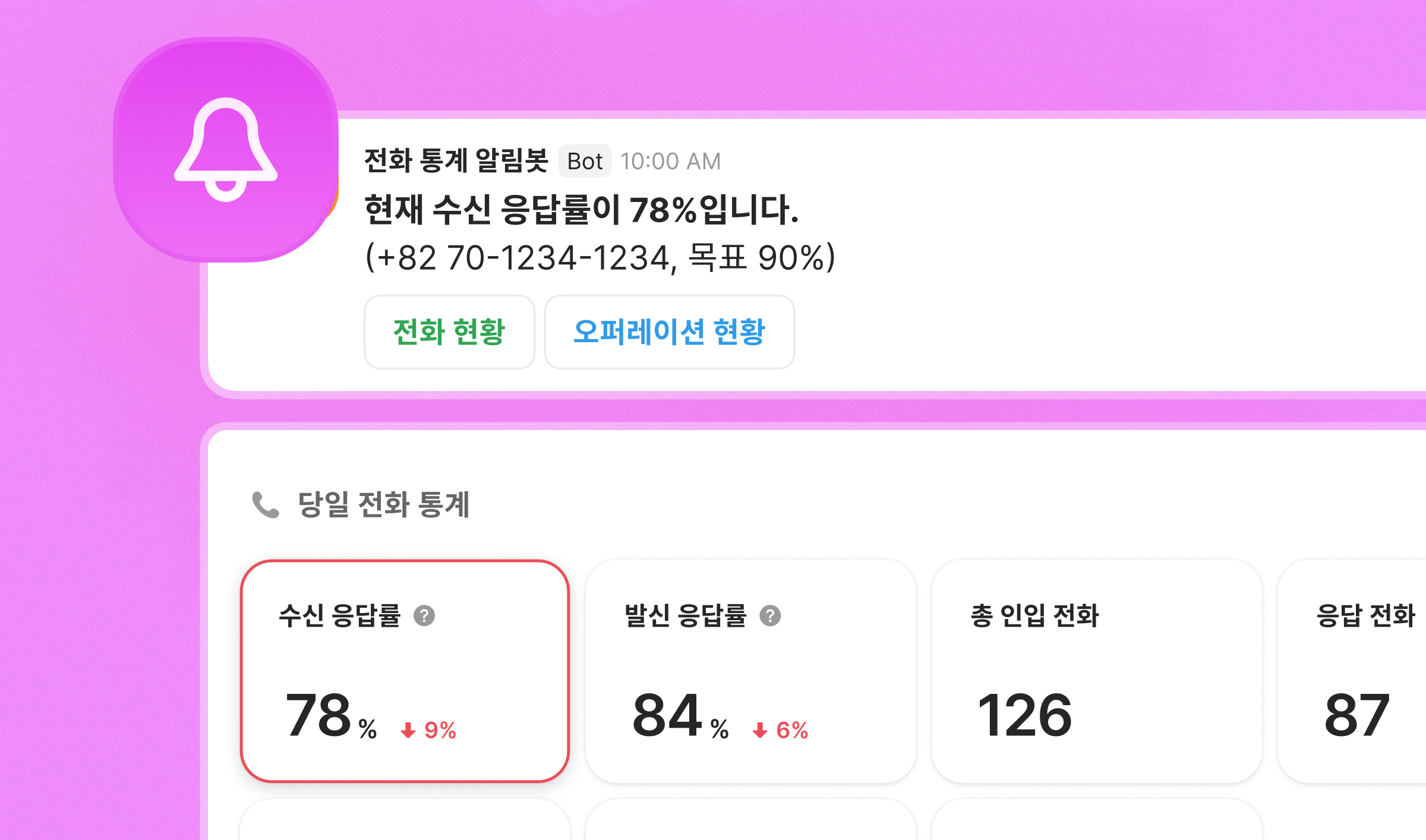 수신 응답률과 서비스 레벨이 목표치보다 낮을 때 대시보드가 강조되며, 팀챗으로도 알림을 받을 수 있어요. 알림을 통해 실시간으로 이상 징후를 확인하고, 전화 상담 품질을 안정적으로 유지해 보세요. (→ 더 알아보기)
