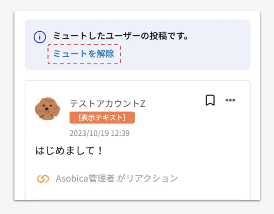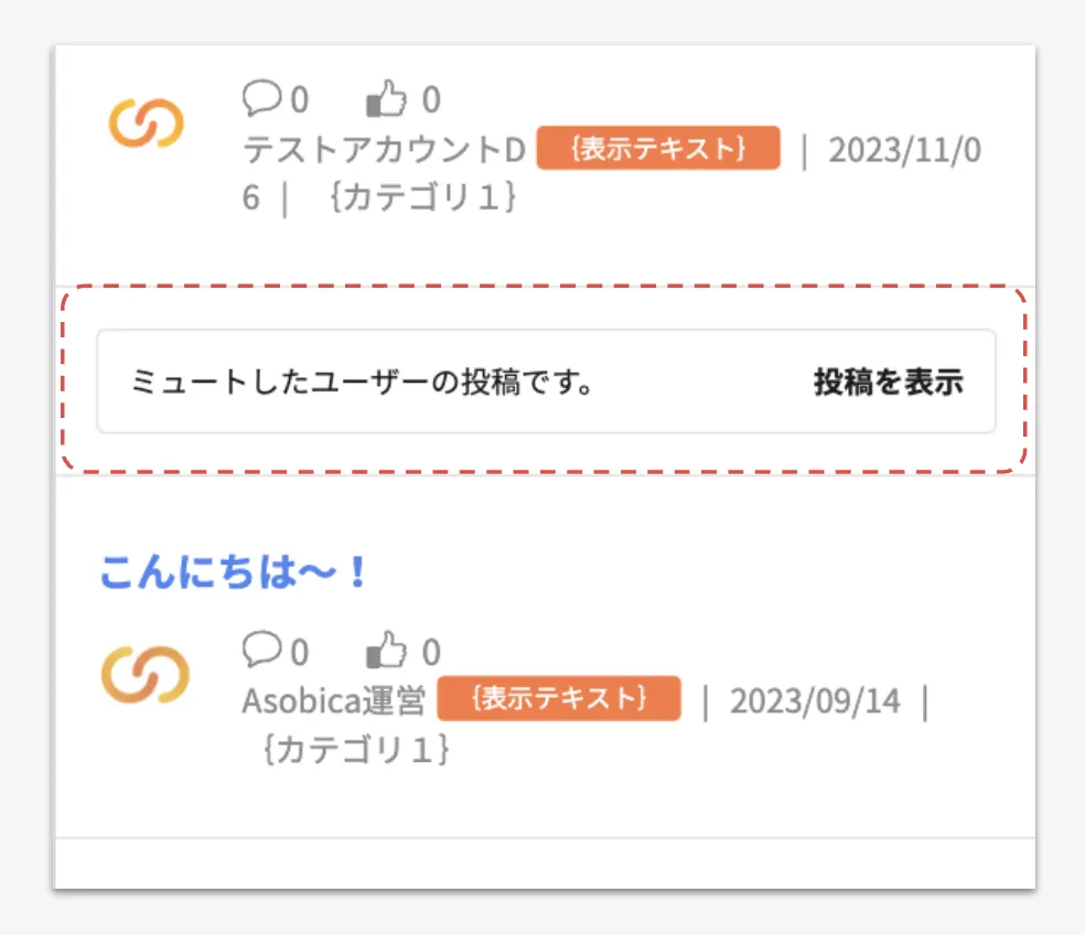 ユーザーをミュートした場合、投稿一覧で当該ユーザーの投稿は非表示になりますが、特定の投稿を閲覧することができます。表示したい投稿の右部にある[投稿を表示]を押下してください。