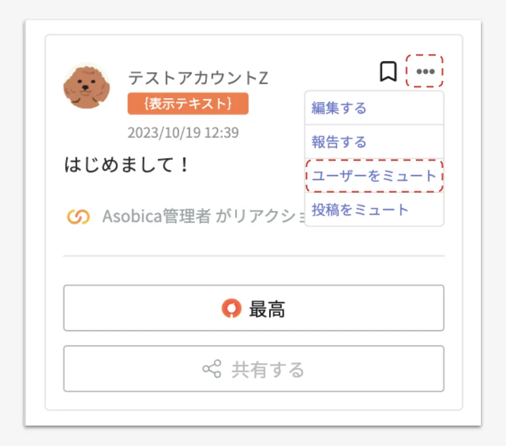 ミュートしたいユーザーの投稿詳細画面を開き、投稿右上部にある3点リーダを押下すると表示される[ユーザーをミュート]を押下してください。