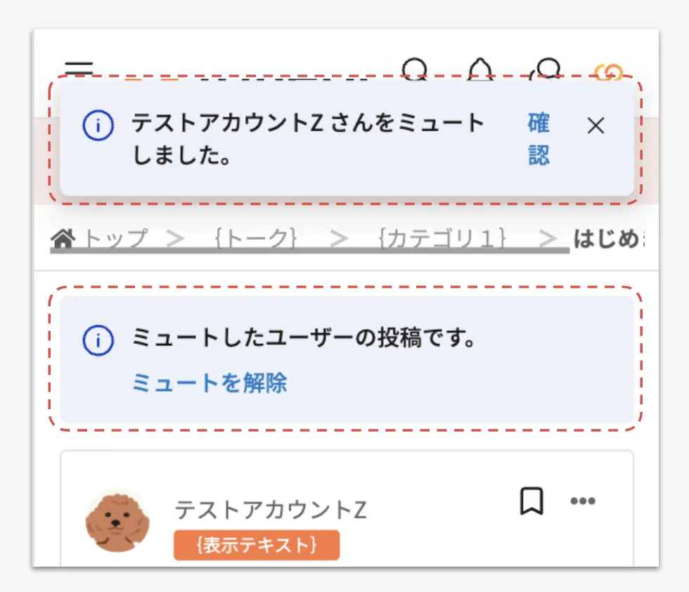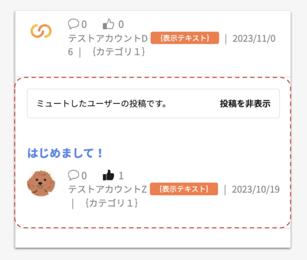 ユーザーをミュートすると当該ユーザーの過去に投稿された投稿分を含む全ての投稿がコミュニティサイトでは以下のように表示されます。