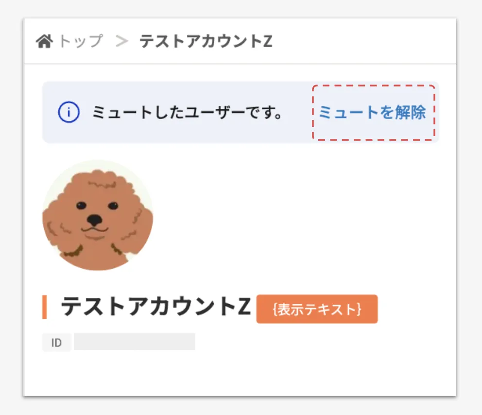 また、マイページから解除することもできます。ミュートを解除したいユーザーのマイページにアクセスし、画面上部に表示される[ミュートを解除]を押下してください。当該ユーザーのミュートを解除することができます。