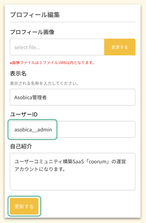 ご希望のユーザーIDを入力し、[更新する]を押下します。※すでに他のユーザーが登録しているユーザIDは登録できません。※4文字から16文字の半角英数字、アンダースコア(_)が使用可能です。