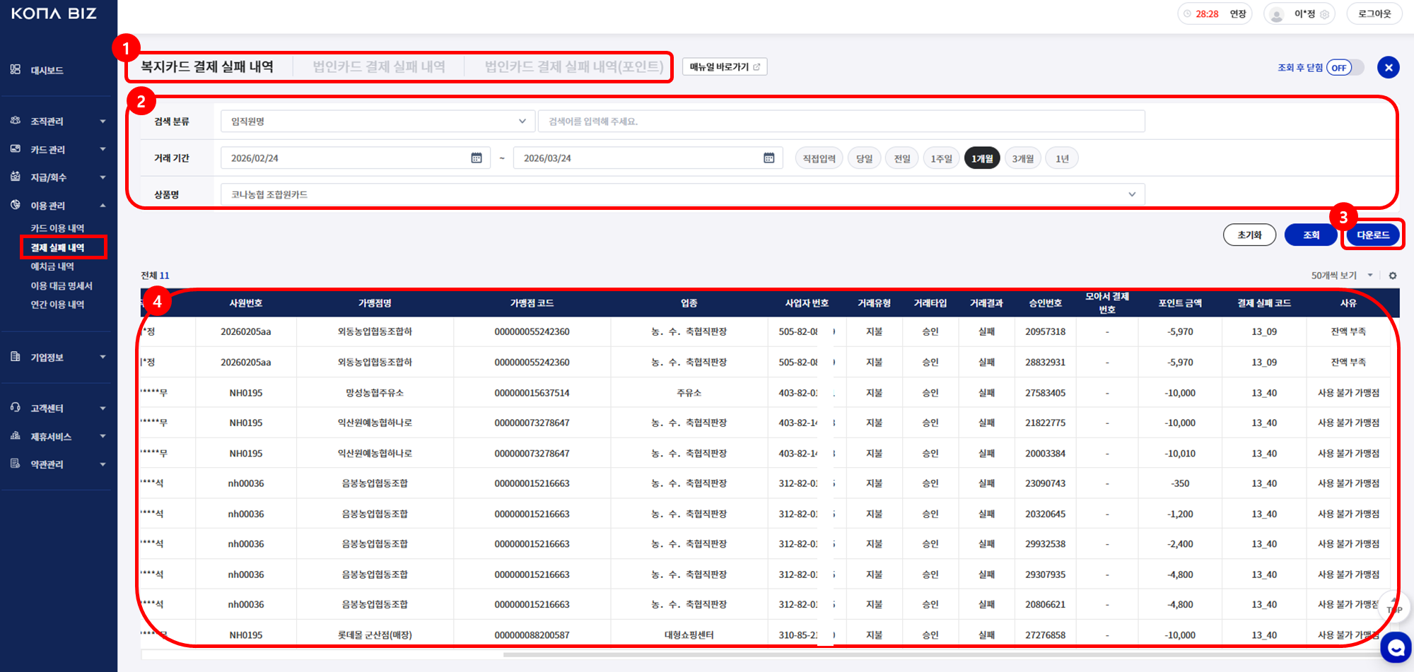 임직원의 결제 실패 내역 확인이 가능합니다.