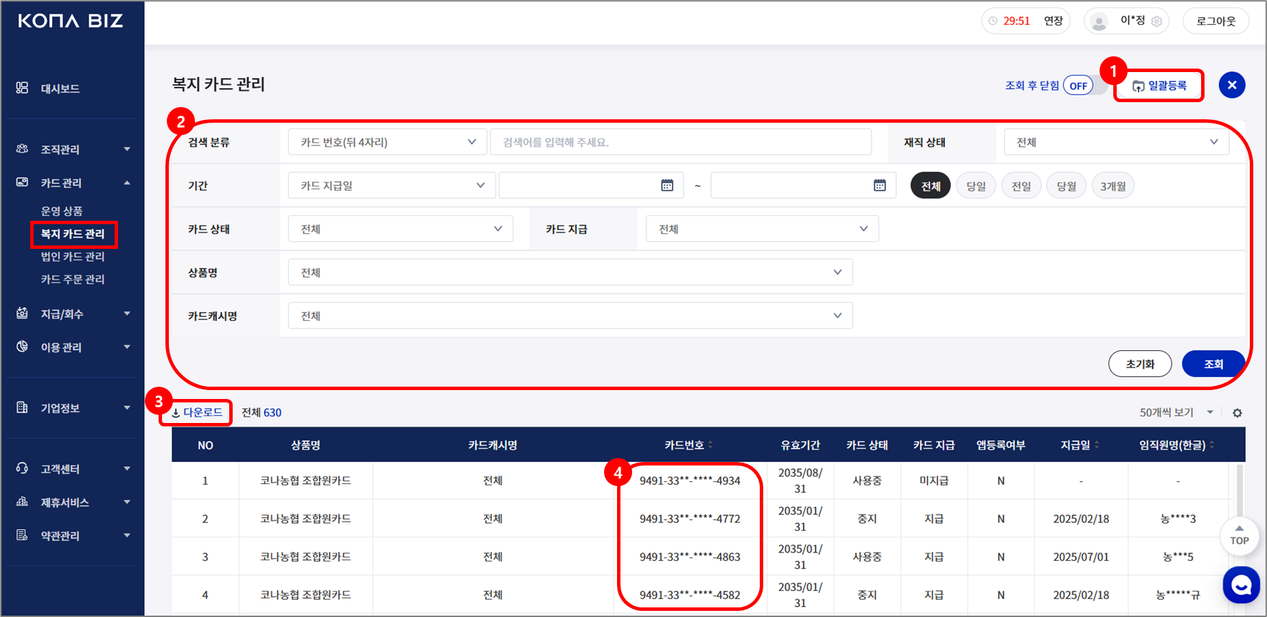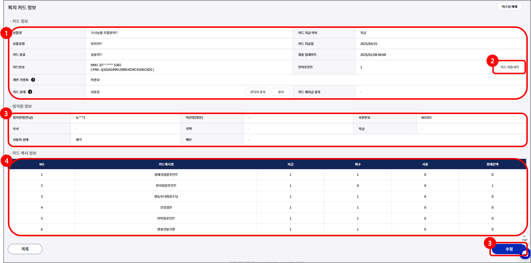 카드번호를 클릭하면 복지카드 정보를 확인할 수 있습니다.