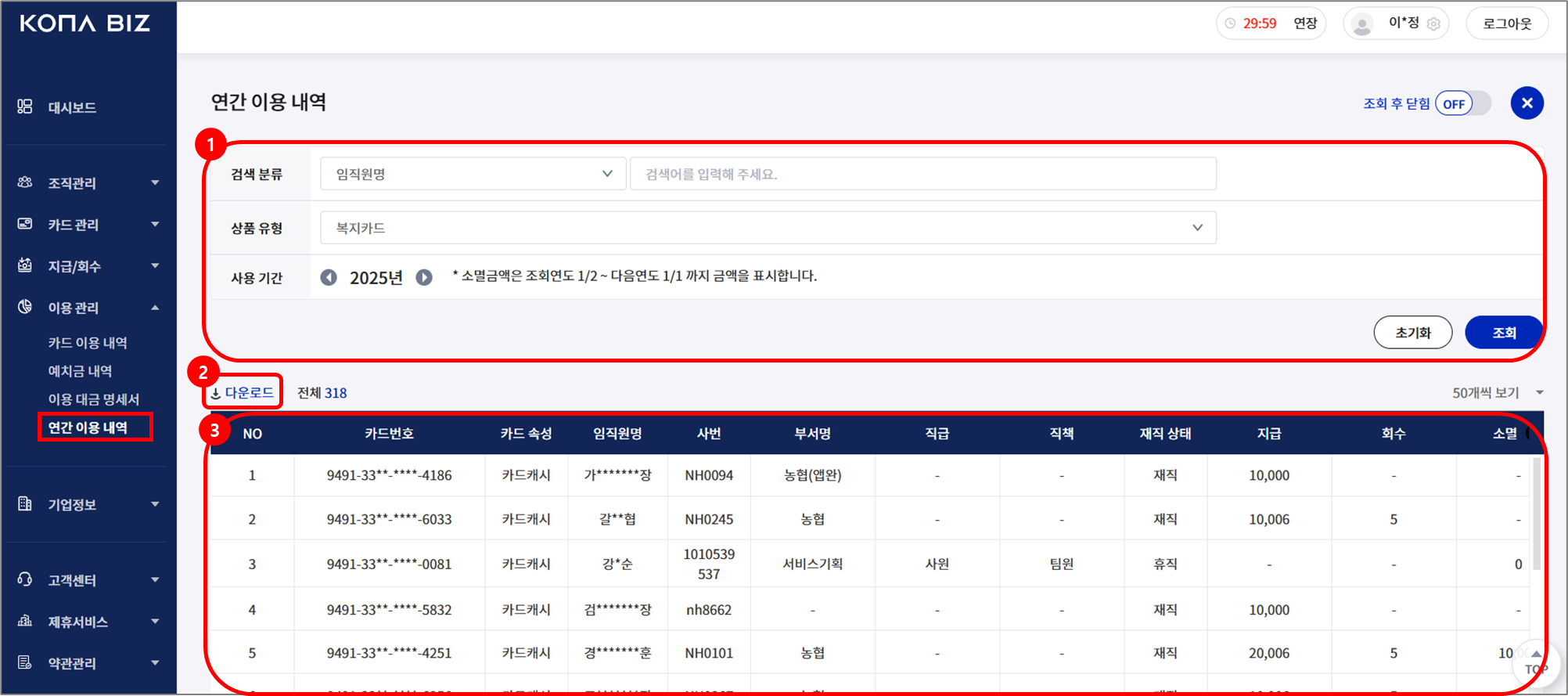 메뉴: [이용 관리] - [연간 이용 내역]임직원 연간 이용금액 합계 확인이 가능합니다.1. 검색검색 값을 설정한 후 조회가 가능합니다.설정 항목검색 분류(임직원명/사원번호)상품 유형사용 기간2. 다운로드등록된 카드 리스트를 엑셀 파일로 다운로드 받을 수 있습니다.3. 제공 항목카드번호카드 속성임직원명사번부서명직급직책재직 상태지급회수소멸모아서 결제사용