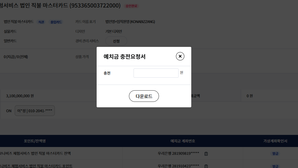 예치금 입금 시 고객사 내부 지출 증빙을 위한 예치금 충전 요청서 발급이 가능합니다.