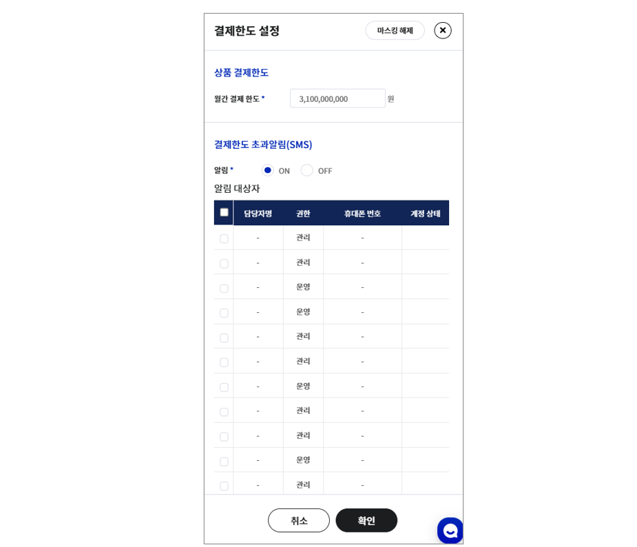 법인 직불 마스터카드에 한하여 결제 한도 정보를 확인 및 설정할 수 있습니다.