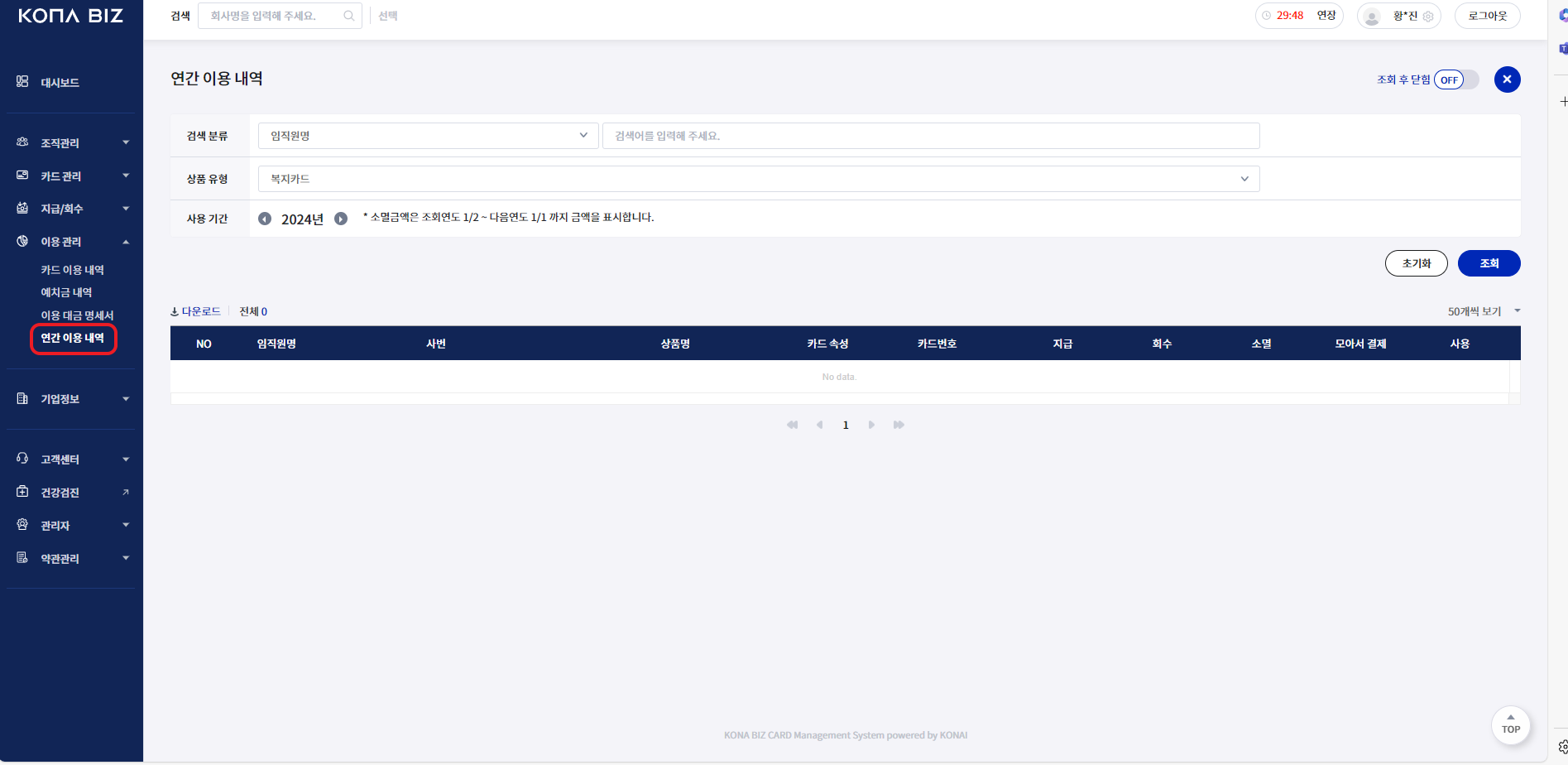 임직원 월별 이용금액 합계 확인이 가능합니다.