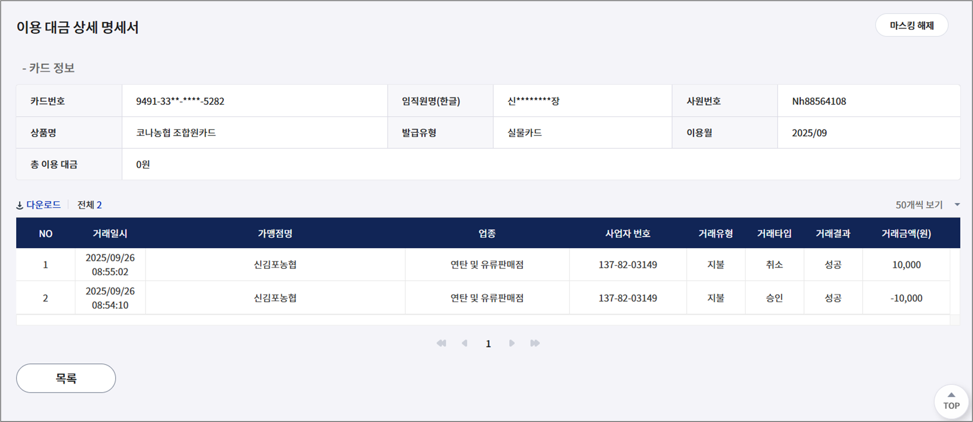 카드 정보(카드번호, 임직원명, 사원번호, 상품명, 발급유형, 이용월, 총 이용 대금)