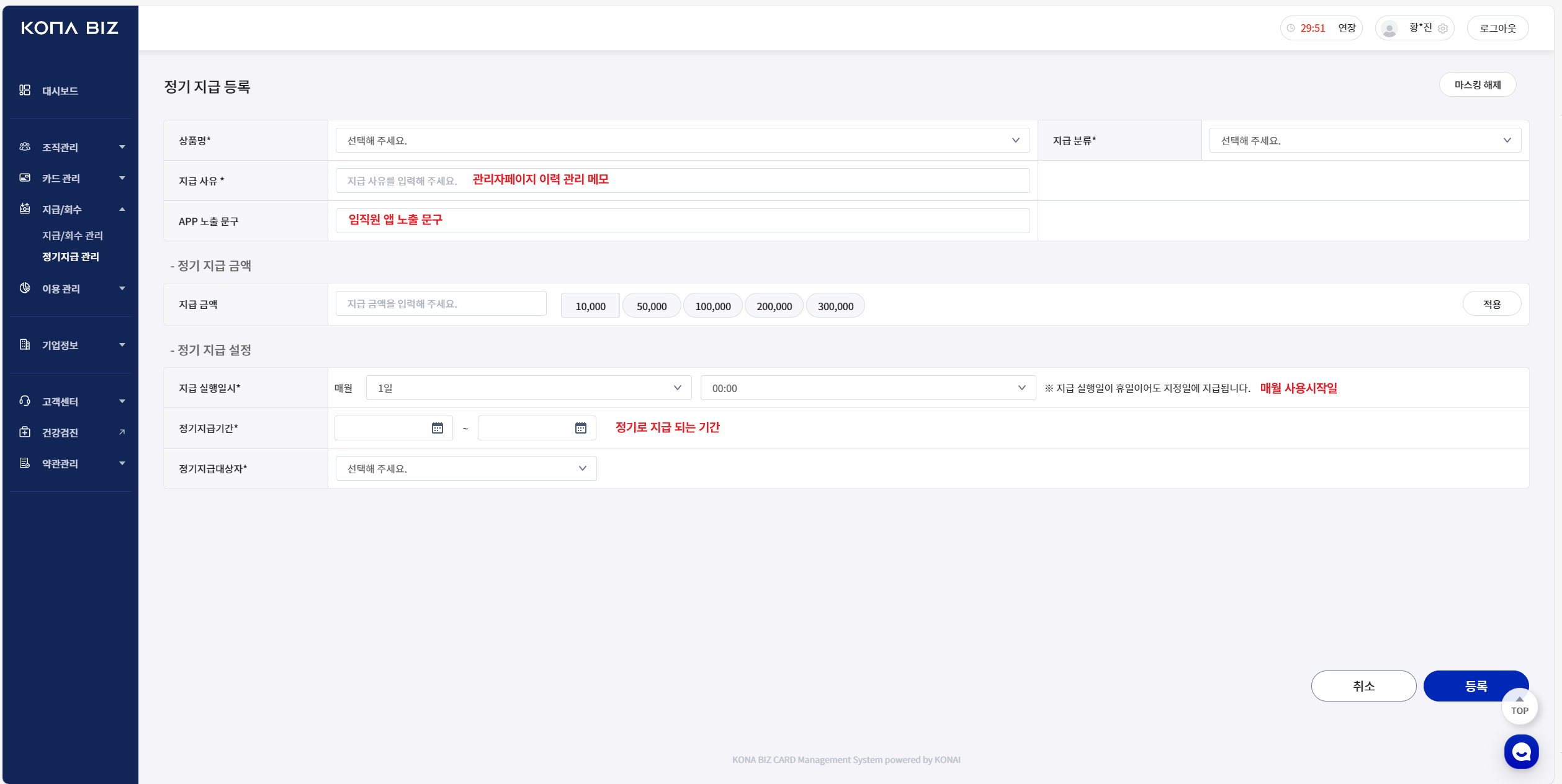 메뉴: [지급/회수] - [정기지급 관리]