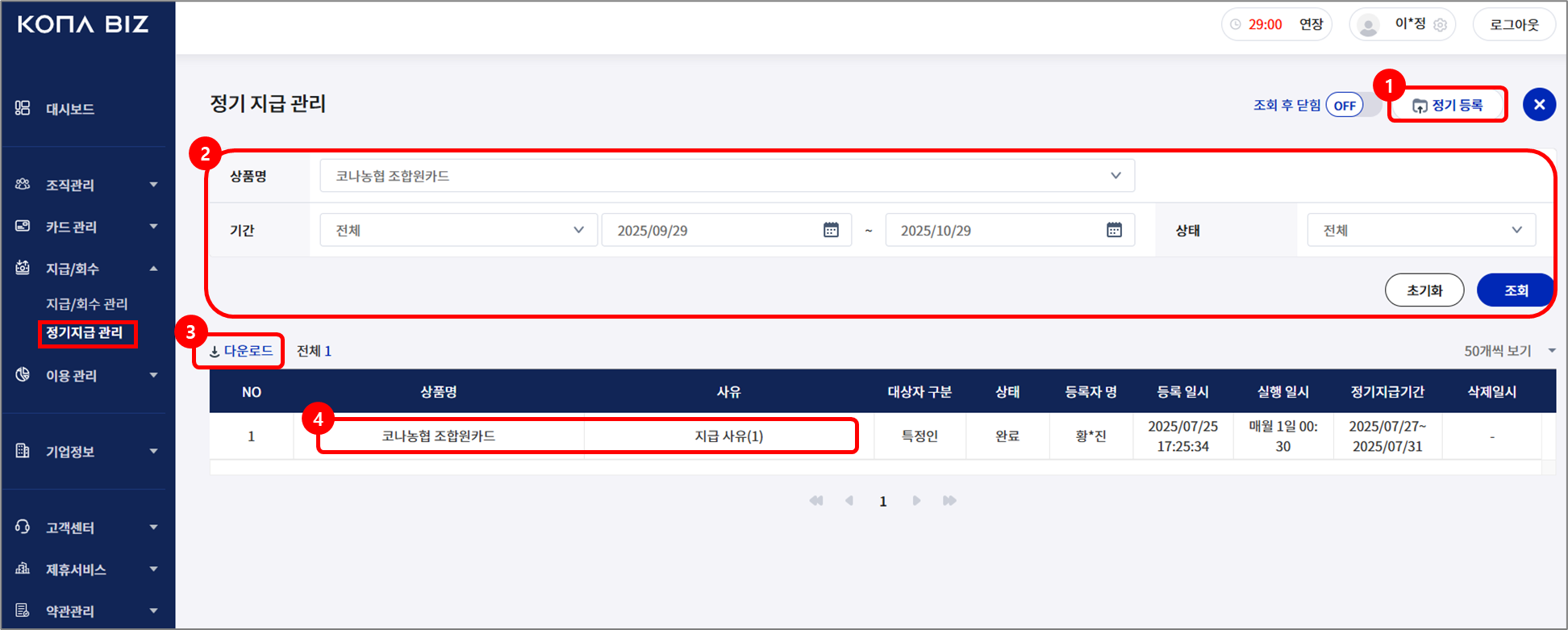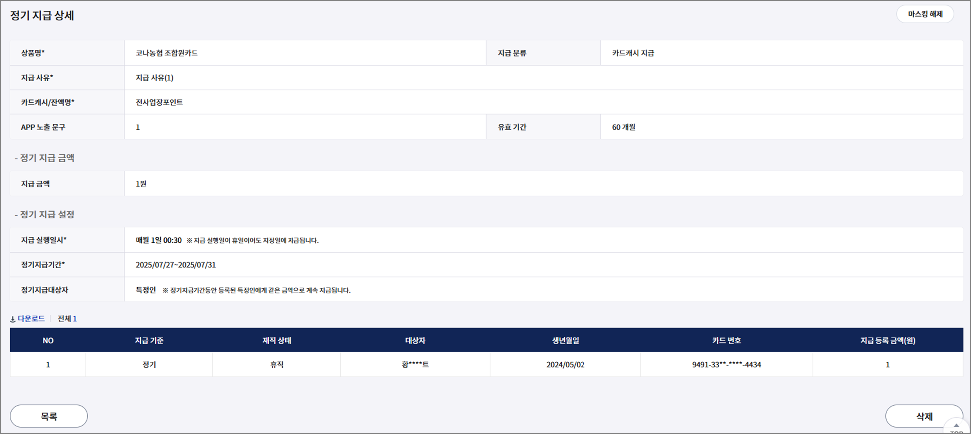 정기 지급 상세 내역 확인 가능