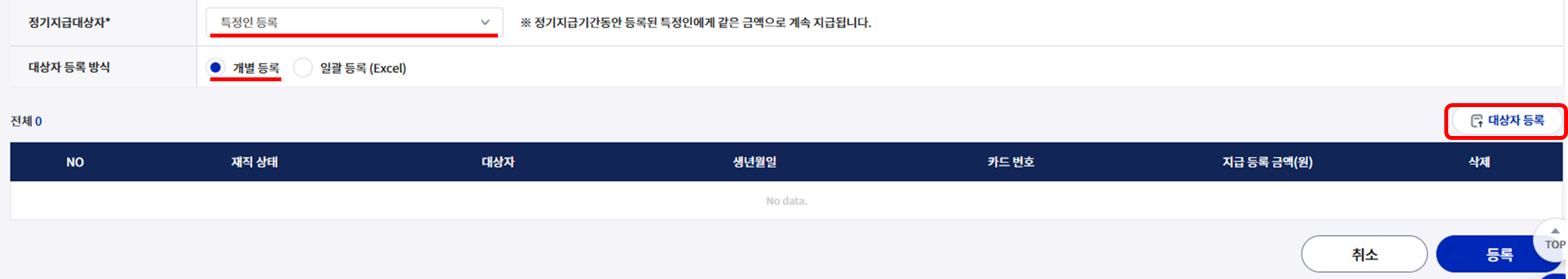 개별 등록 : 개별 대상자 선택 후 등록이 가능합니다.