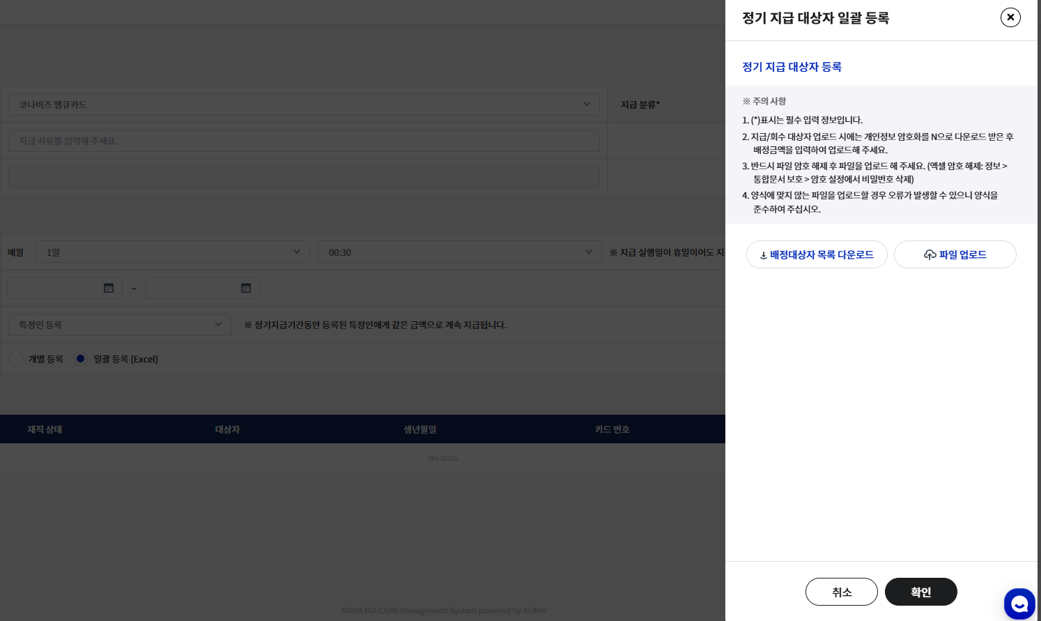등록된 정기 지급 리스트를 엑셀 파일로 다운로드 받을 수 있습니다.