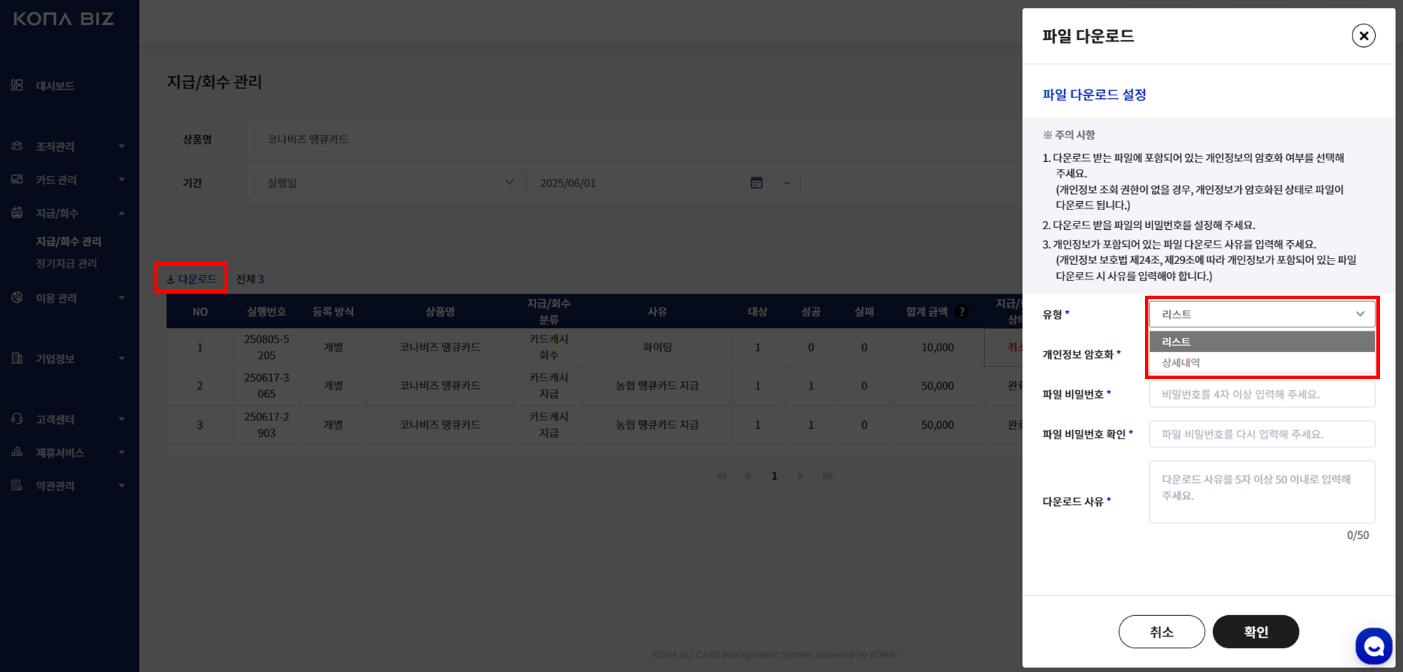 지급/회수 목록 다운로드 시 2가지 유형 중 선택하여 다운로드 가능합니다.