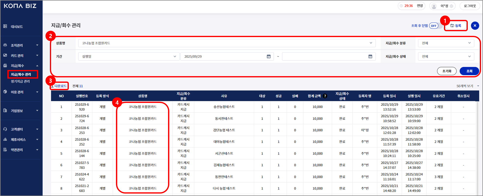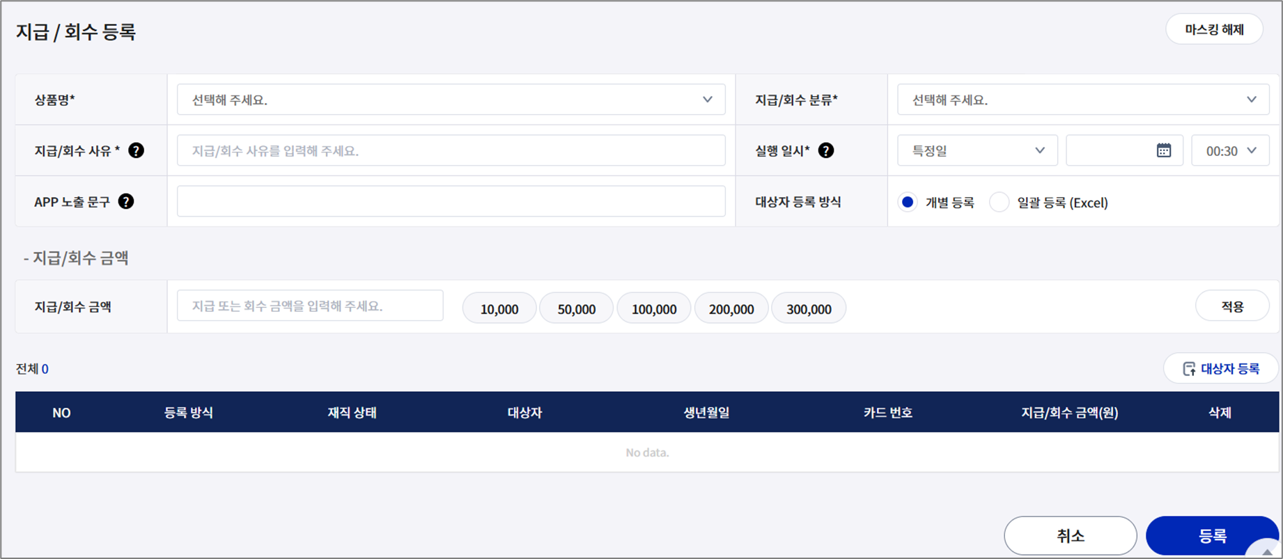지급/회수에 대한 정보를 입력합니다. 개별/일괄 등록이 가능합니다.